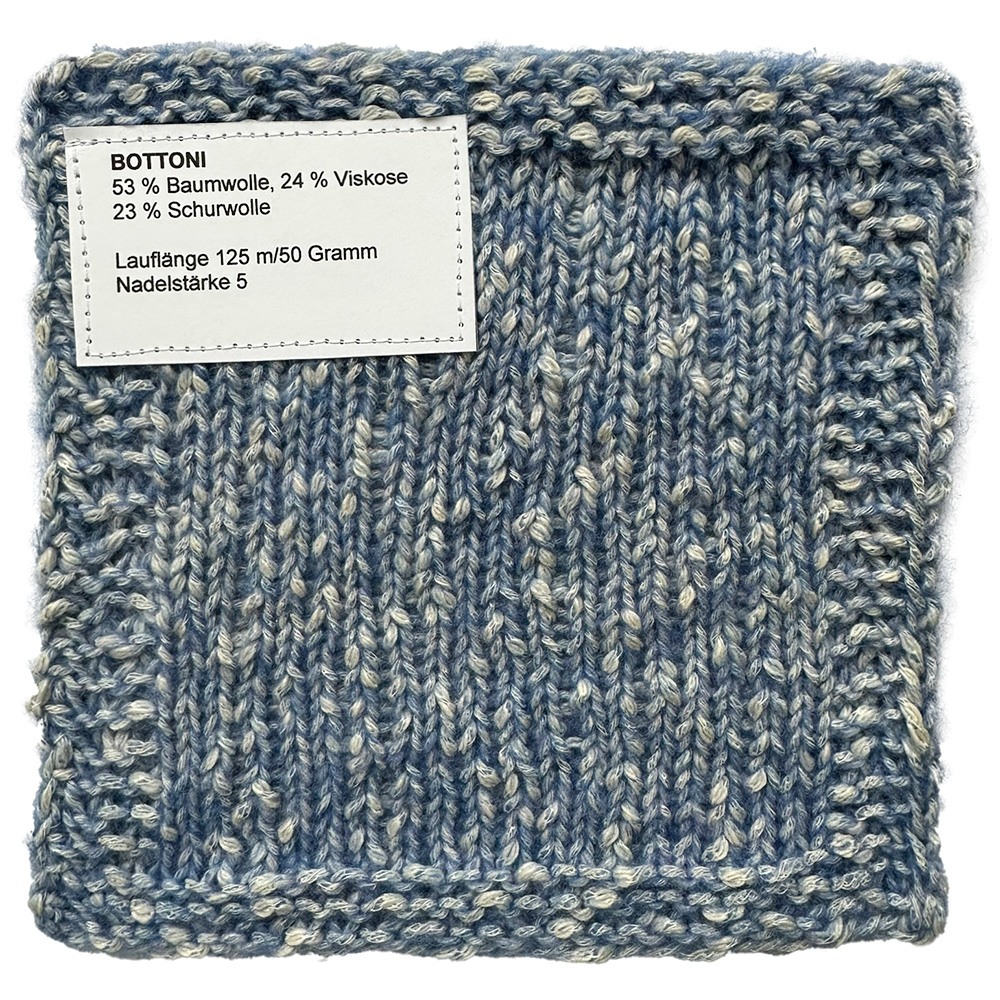 Bottoni hat einen besonderen Charakter: Im Inneren vereint es ein weiches Baumwoll-Viskose-Gemisch, das von einem feinen Mantel aus zarten Merinofasern umhüllt wird. Eingestreute Noppen setzen spielerische Akzente und verleihen dem Garn seinen unverwechselbaren, lebendigen Look.