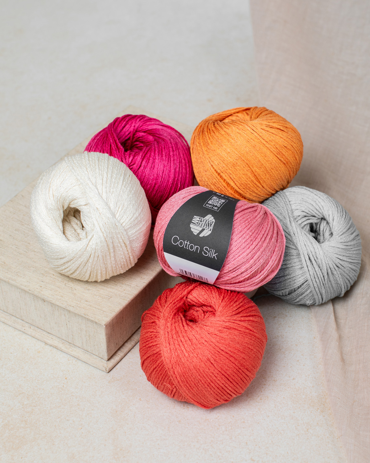 Cotton Silk ist ein edles Sommergarn mit natürlicher Eleganz. Die hochwertige Mischung aus Baumwolle und Seide verleiht dem Garn einen weichen Griff, einen zarten Glanz und ein angenehm glattes Maschenbild. Es ist atmungsaktiv, temperaturausgleichend.