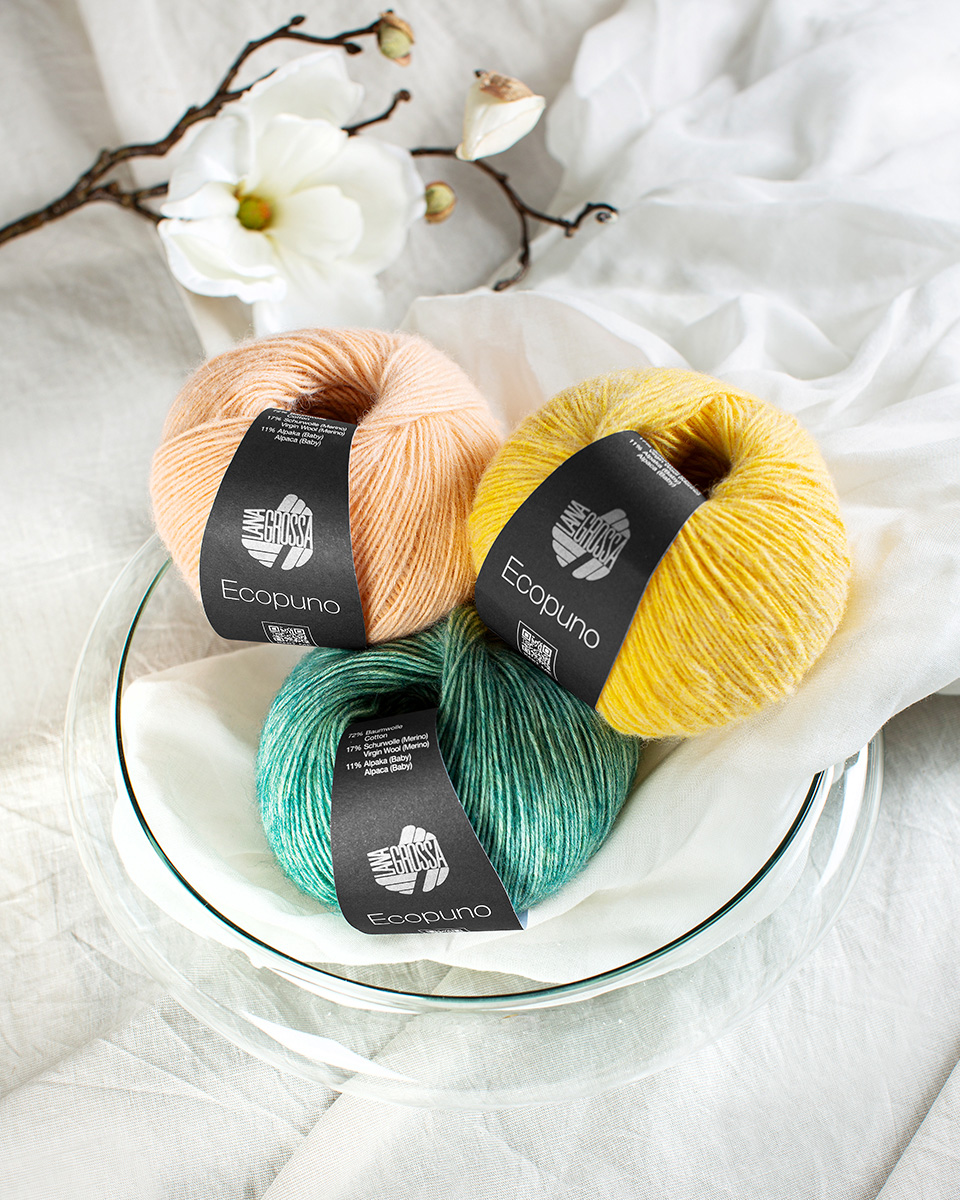 Ecopuno ist ein hochwertiges Ganzjahresgarn mit weichem, leichtem Griff und edlem Maschenbild. Die innovative Materialmischung aus Baumwolle, Merinowolle und Alpaka vereint das Beste aus drei Naturfasern: kühlende Frische, angenehme Wärme und kuschelige Weichheit.