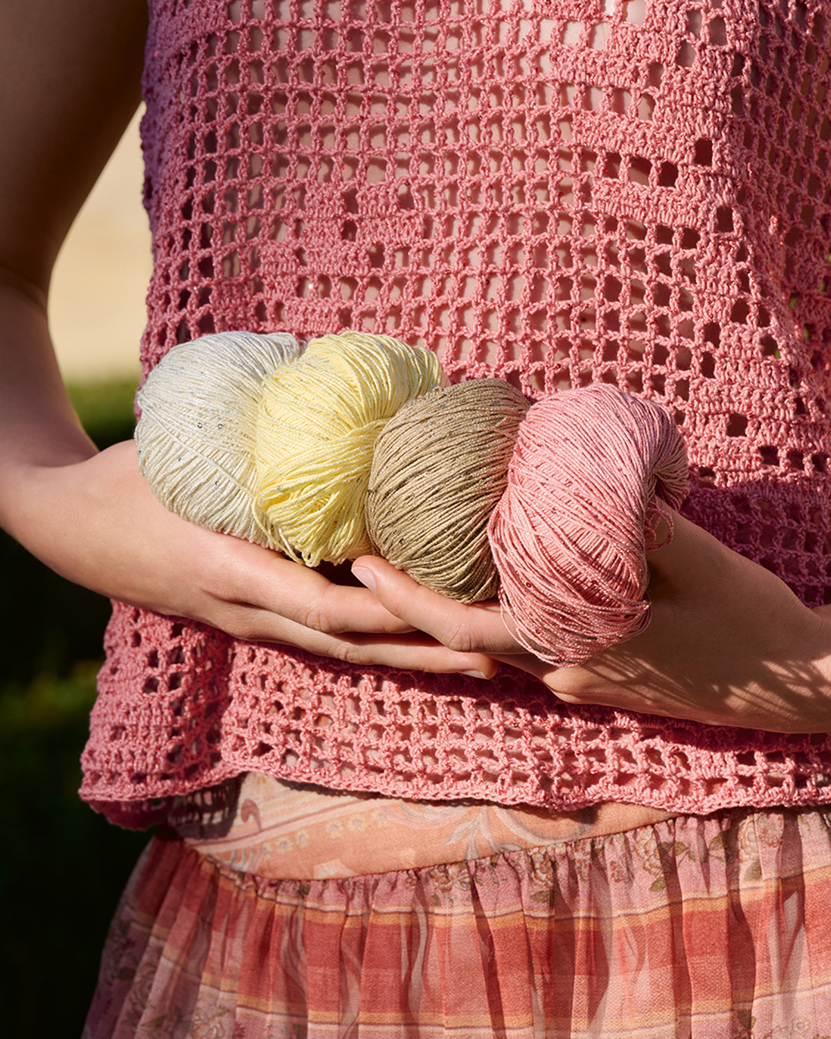 Hochwertige Baumwollfäden werden, zusammen mit einem Faden winziger Pailletten, zu einem dünnen Garn gedreht. Ton-in-Ton gefärbt, setzen sie dezent schimmernde Glanzpunkte.