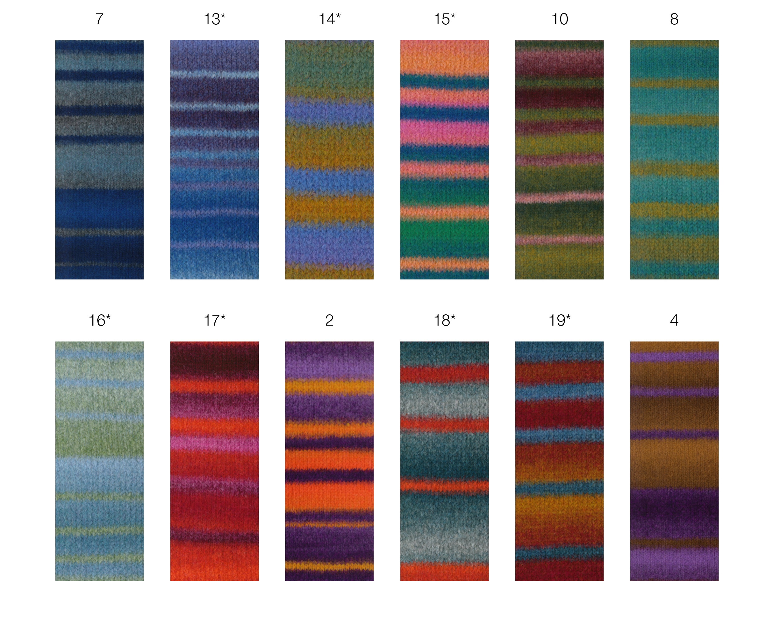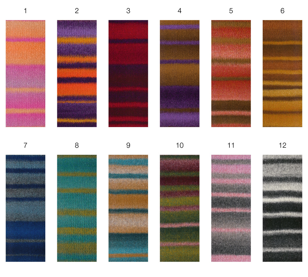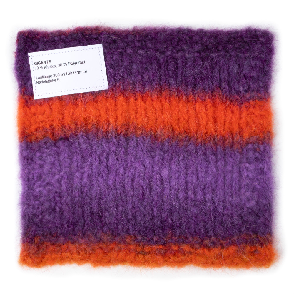 Voluminöses Alpakagarn mit Effektstruktur und Streifen im Farbverlauf.
