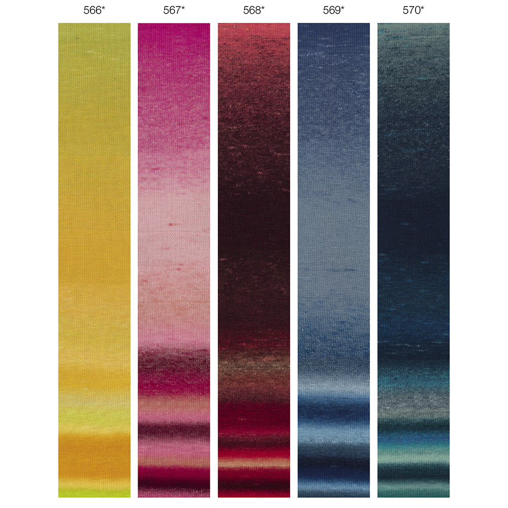Das eindruckvolle Dochtgarn aus 100% Merino extrafine zaubert schmale, farbige Streifen und sanfte, extralange Degradé-Farbverläufe