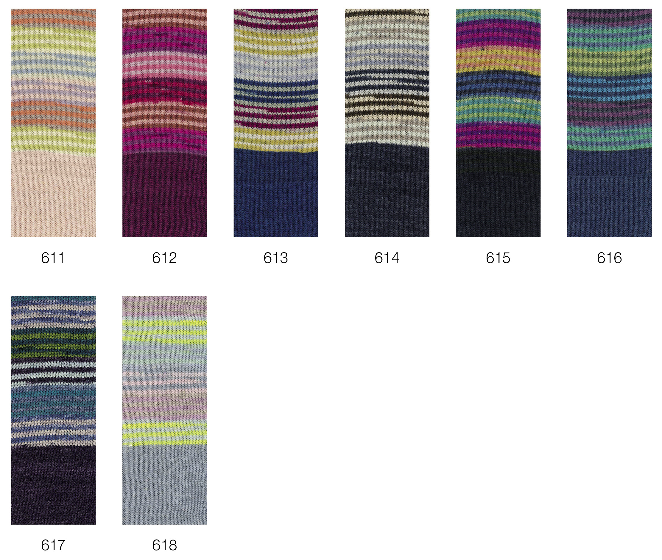 Jedes Knäuel enthält zwei Mal den exakt gleichen Farbverlauf, Anfang und Übergang sind mit einem Kontrastfaden markiert, so erhalten Sie ohne Suchen und Abwickeln zwei identische Socken; mit Quick Start