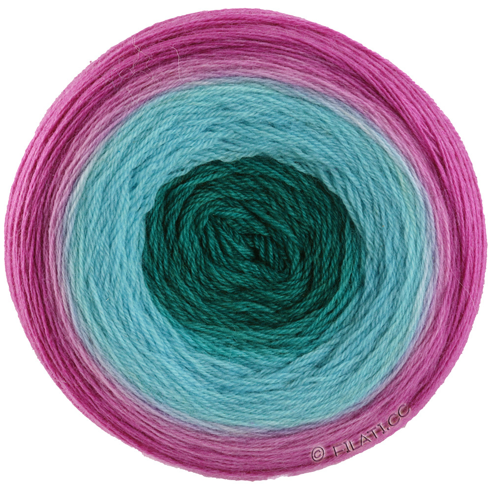 Extrafeine Merinowolle in Lace-Garnstärke im Farbverlauf bedruckt.