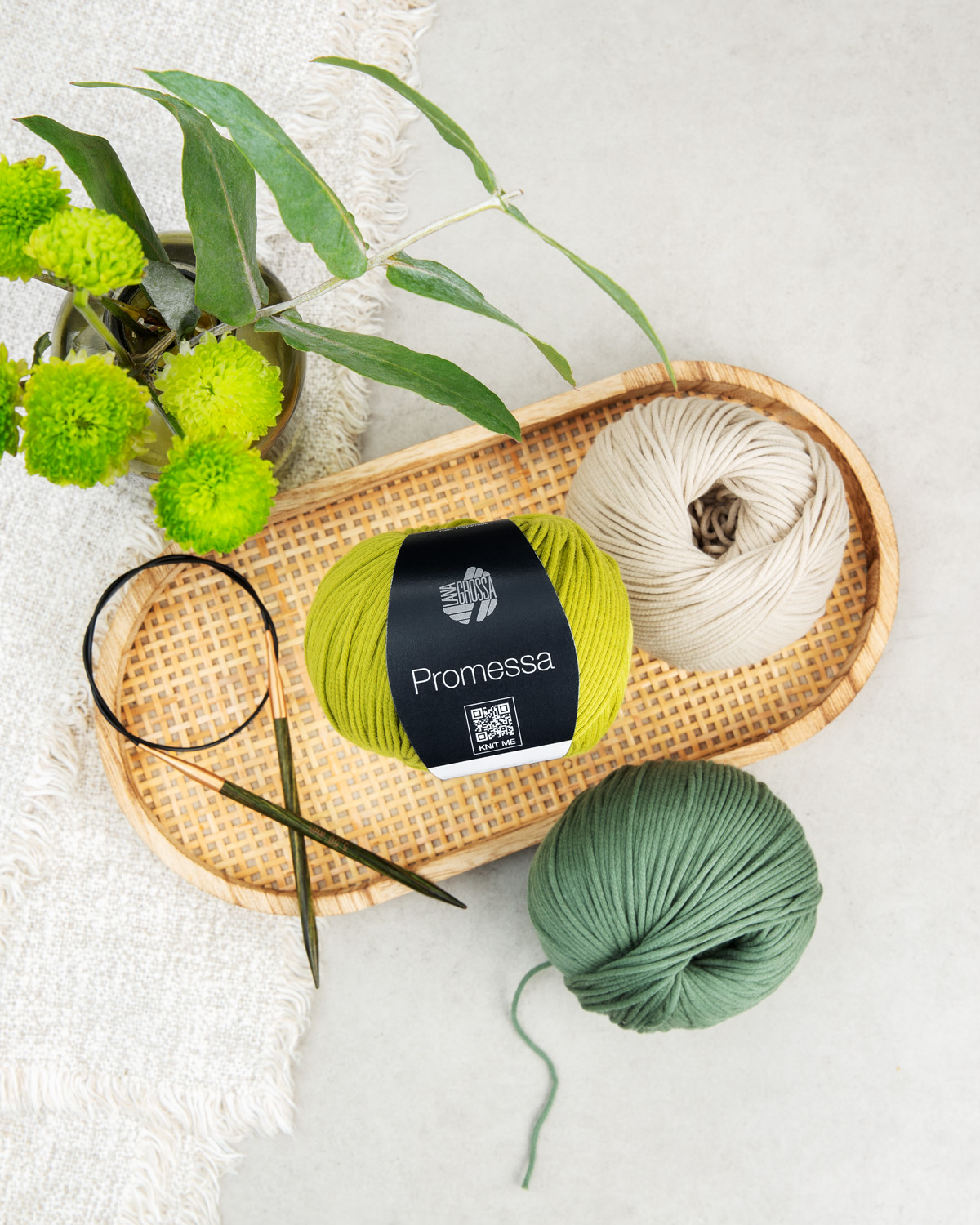 Promessa ist ein weiches, voluminöses Schlauchgarn mit natürlicher Ausstrahlung und modernem Look. Die innovative Mischung aus Bio-Baumwolle und recyceltem Polyamid sorgt für ein angenehm leichtes Tragegefühl, sanften Griff und ein klares Maschenbild.