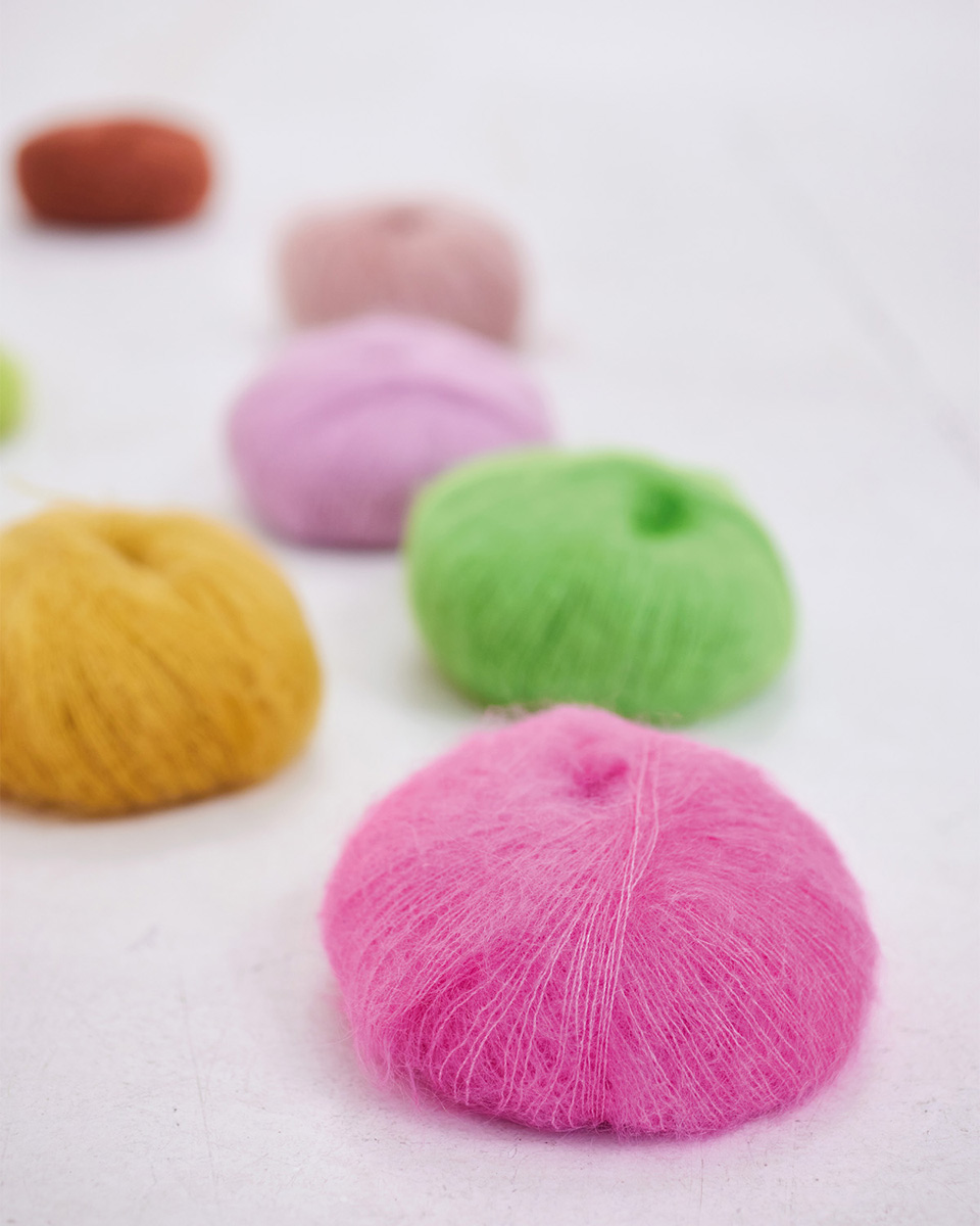 Ob einzeln verstrickt für ein transparentes, luftiges Ergebnis oder doppelt kombiniert für mehr Volumen – Silkhair verleiht jedem Strickstück eine exklusive, feminine Note.