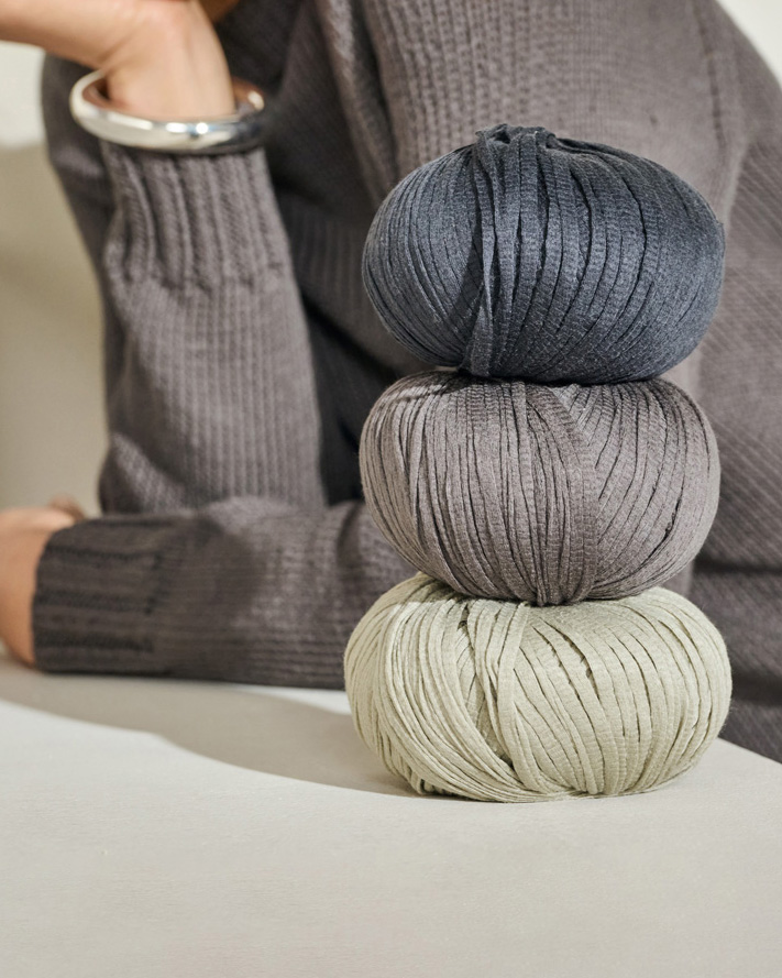 Zarte Baumwollfasern werden für dieses Garn zu einem feinen Bändchengarn verarbeitet, dessen matte, papierfeine Optik einen unverwechselbar cleanen Charakter verleiht.