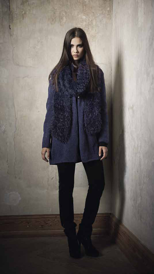 Lana Grossa-Qualität „Felpa” (60 % Polyamid, 40 % Schurwolle, LL = ca. 80 m/50 g): ca. 400 (450 – 500) g Marine (Fb. 17); Stricknadeln Nr. 6, 1 Rundstricknadel Nr. 6, 80 cm lang, 1 Wollhäkelnadel Nr. 5; 1 Knopf von Union Knopf, Art. 450318, Fb. 80 schwarz, 34 mm Ø.