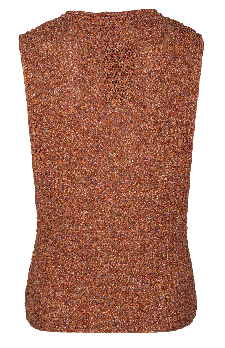 Lana Grossa-Qualität „About Berlin Spotty” (55 % Baumwolle, 26 % Polyamid, 19 % Polyester, LL = ca. 125 m/50 g): ca. 450 (500 – 550) g Kupfer bunt (Fb. 10); 1 Wollhäkelnadel Nr. 4; 1 farblich passender Knopf, ø 18 mm.