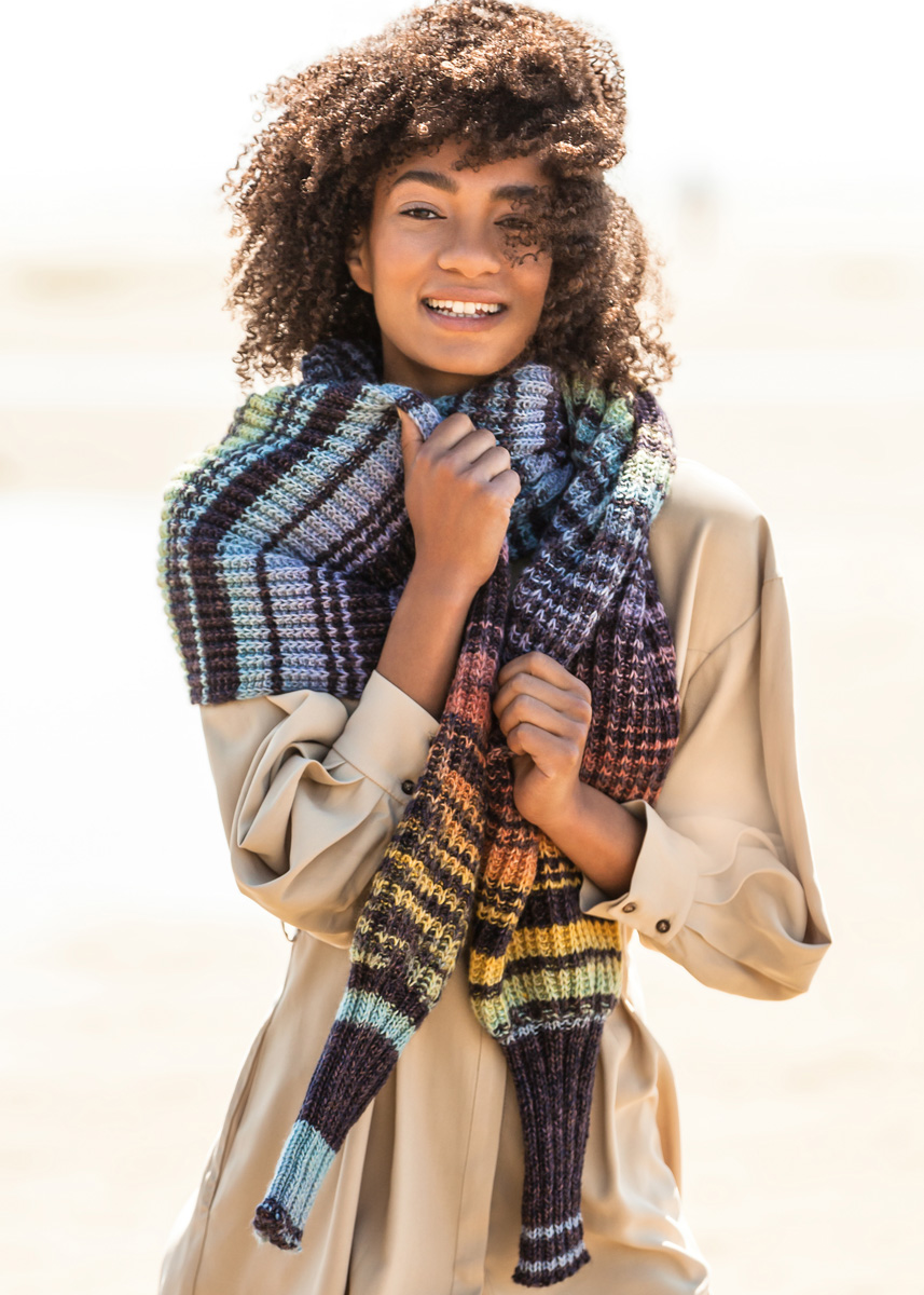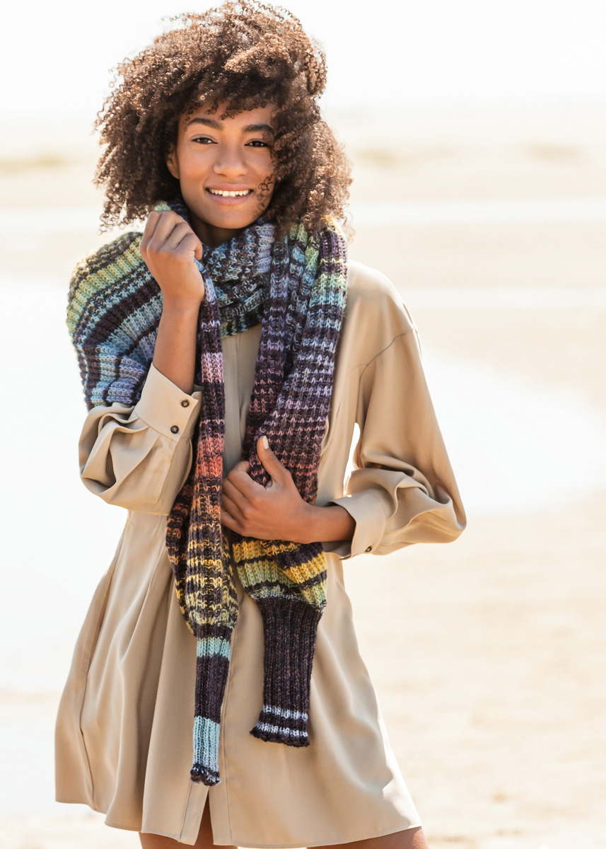 Lana Grossa Gomitolo Bene (60% Schurwolle Merino, 40% Polyacryl, Lauflänge 700 m/200 g), 400 (600) g Lachs/Schwarzbraun/ Gelb/Khaki/Graublau (Fb 751); 1 Rundstricknadel Nr. 5, 80 cm lang und 1 Spiel Stricknadeln Nr. 4,5.
