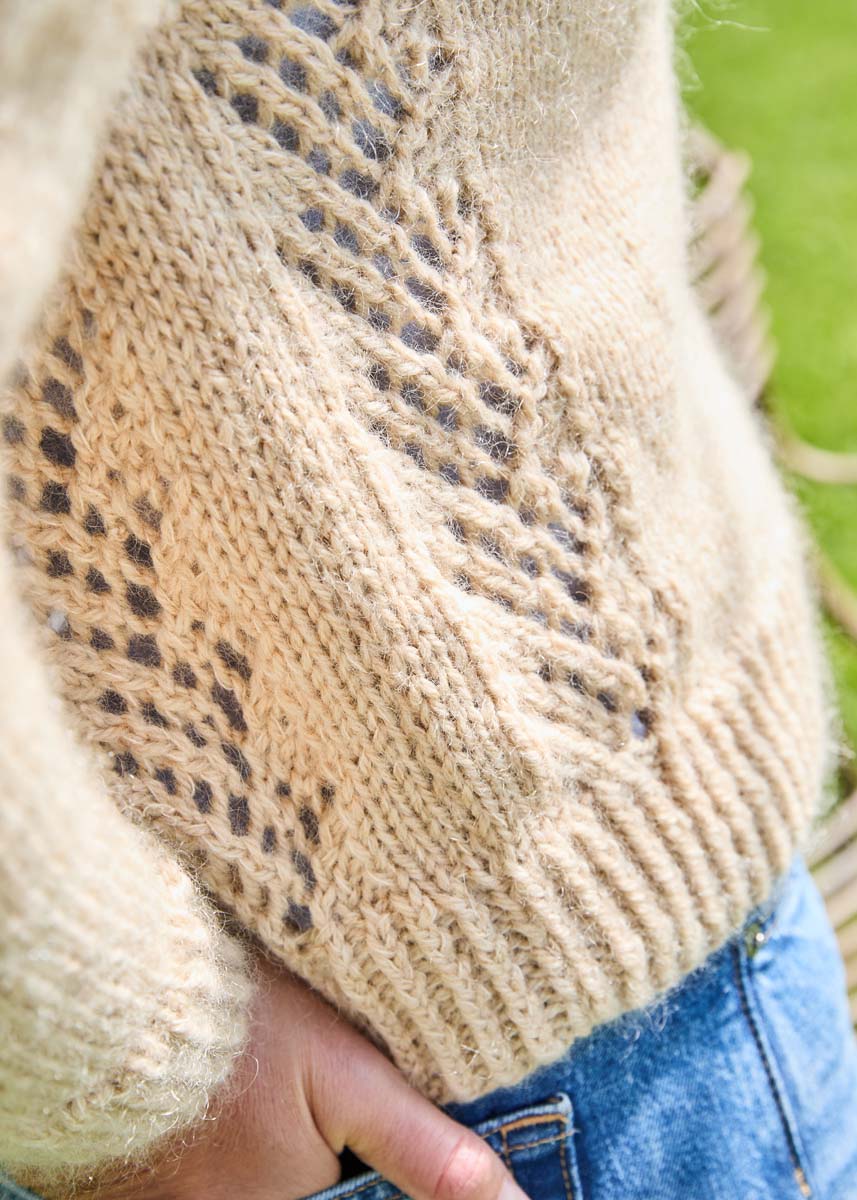 Lana Grossa-Qualität „Landlust- Naturwolle“ (100% Norwegische Schurwolle, LL ca. 85 m/50 g), 500 (550 - 600) g in Beige (Fb 17) und „Landlust- Kidmohair“ (70% Mohair Superkid, 30% Baumwolle, LL ca. 225 m/25 g), je 100 (125 - 125) g in Eierschale (Fb 2); 1 Rundstricknadel Nr. 5,5, 80 cm lang, 1 Rundstricknadel Nr. 5, 40 cm lang, 4 Maschenmarkierer (MM).