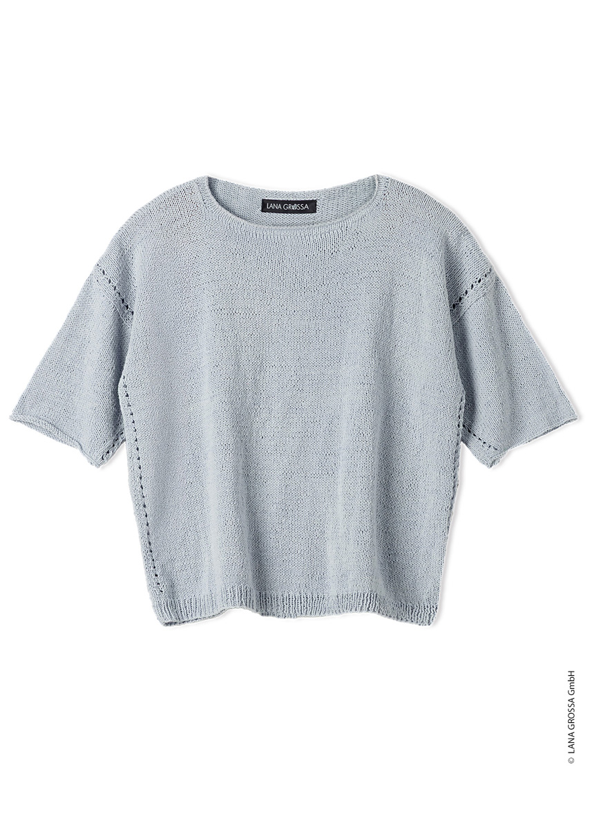 Lana Grossa-Qualität "Setapura" (100% Seide, LL = 200 m/50 g): ca 250 (250) 300 (300) 350 (400) g Eisgrau (Fb. 20); je eine Rundstricknadel 3,5 mm und 4 mm, 40cm lang und 80 - 100 cm lang und 5 Maschenmarkierer.
