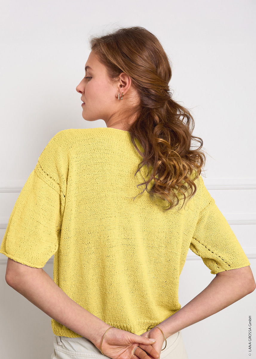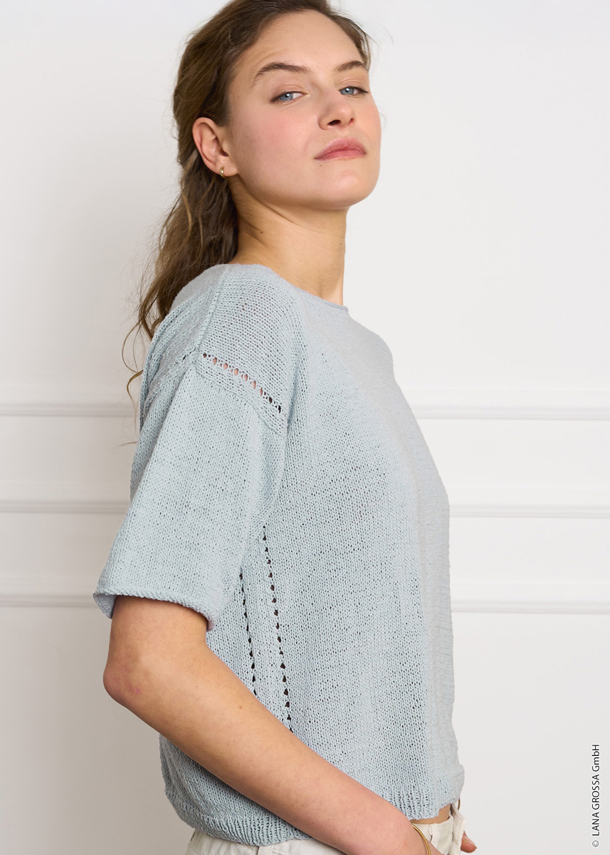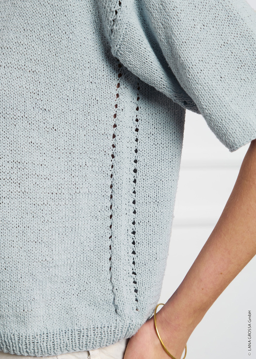 Das Alessandra Shirt wird in Einzelteilen von unten nach oben gestrickt. Zunächst werden Vorder- und Rückenteil gerade hochgestrickt. An beiden Seiten beider Teile wird die Höhe der Armausschnitte markiert. Nach dem Zusammennähen der Schulternähte werden Maschen für die Ärmel aufgenommen: Für den ...