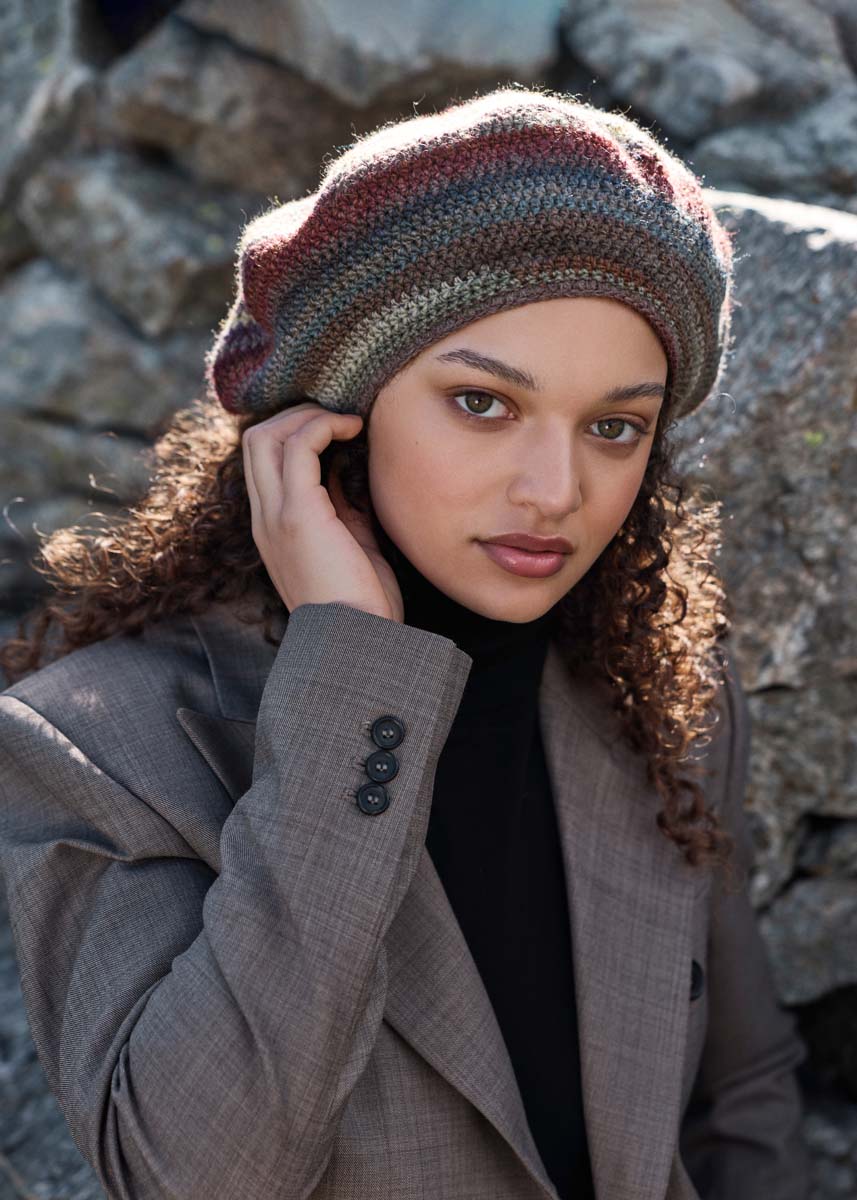 Lana Grossa-Qualität „Gomitolo Intenso“ (50 % Schurwolle, 50 % Polyacryl, LL = ca 700 m/200 g): 1 Knäuel = ca 200 g Graubeige/Taupe/Rot-/Graubraun/Dunkelgrau/ Grünbraun/Dunkelpetrol (Fb 234); 1 Häkelnadel Nr 4; 1 Maschenmarkierer.