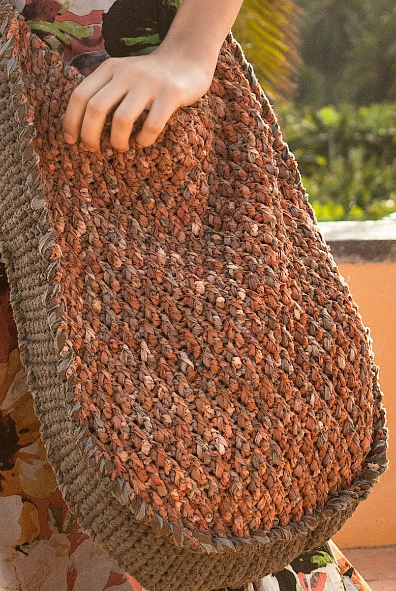 Lana Grossa-Qualität „Florida” (100 % Viskose, LL = ca. 50 m/50 g): ca. 550 g Rotbraun/ Zimtbraun/Graubraun (Fb. 3) und Lana Grossa-Qualität „Paradiso” (100 % Baumwolle, LL = ca. 65 m/50 g): ca. 300 g Khaki (Fb. 20); fürs Umstechen: Lana Grossa-Qualität „Bicolore” (55 % Polyamid, 45 % Baumwolle, LL = ca. 70 m/50 g): ca. 50 g Grau/Braun (Fb. 12); 1 Wollhäkelnadel Nr. 7, 1 stumpfe Sticknadel mit großem Öhr.