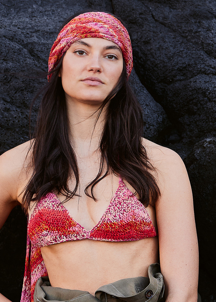 Lana Grossa-Qualität „Gomitolo Selezione 3“ (65 % Baumwolle, 35 % Polyacryl, LL = ca. 270 m/100 g): ca. 100 g Rot/Pink/Rosa/Ocker/Cognac/Hellgrau (Fb 3001); Häkelnadel Nr 3,5; 2 Socken-Stricknadeln Nr 4.