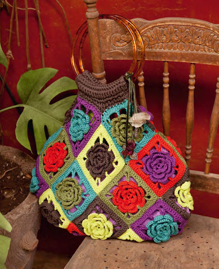 Rosengarnierte Häkelquadrate, auf die Spitze getrieben und nach Schema zusammengenäht – dieser bunte Hippie-Beutel mit kreisrunden Henkeln in edler Horn-Optik steckt voller Fantasie – und obendrein viel weg. (ca. 40 x 45cm ohne Griffe)