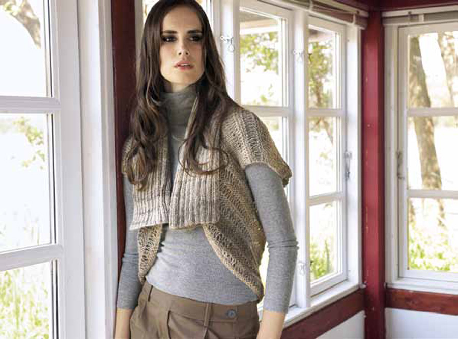 Lana Grossa-Qualität „Cinque Alto” (42% Schurwolle, 38% Polyacryl, 20% Alpaka, LL = ca. 150 m/50 g): ca. 200 (250) g Beige/Taupe/Mokka (Fb. 11); Stricknadeln Nr. 5,5 und 6,5.