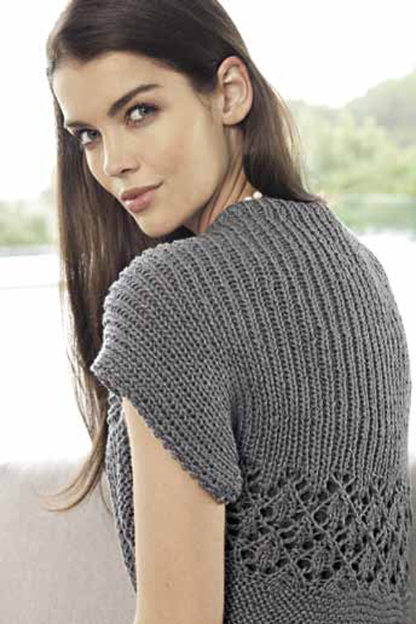 Lana Grossa-Qualität „Linarte” (40 % Viskose, 30 % Baumwolle, 20 % Leinen, 10 % Polyamid, LL = ca. 125 m/50 g): ca. 300 (350) g Dunkelgrau (Fb. 46); Stricknadeln Nr. 7.