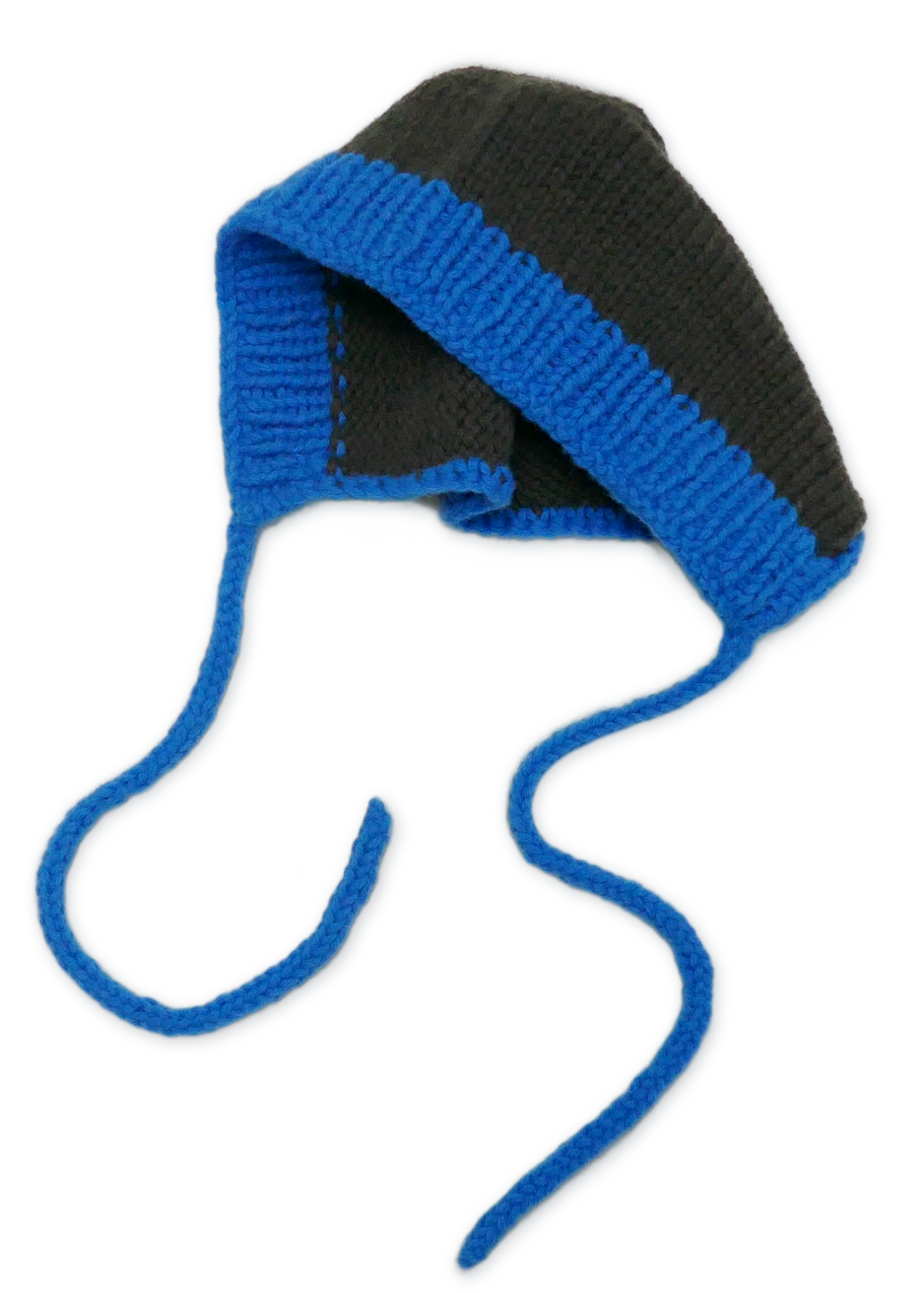 Die Cappi wird vom Hinterkopf begonnen und dann in einem Stück nach oben gestrickt. Am Ende werden die Bänder noch extra drangestrickt, sie können aber auch einfach geflochten werden.