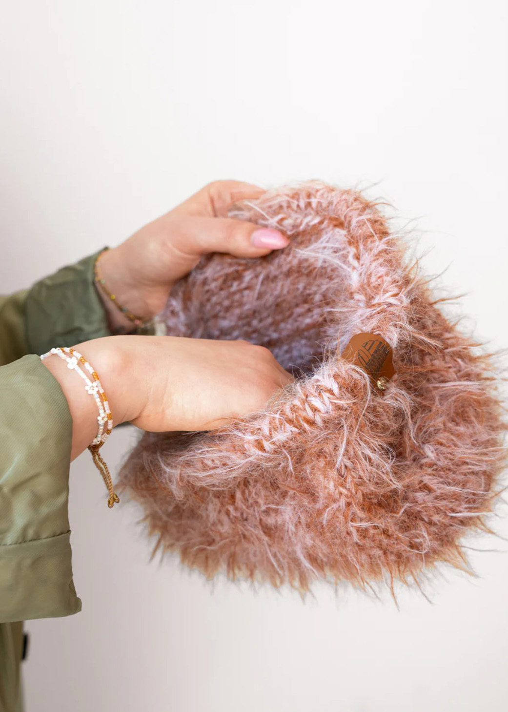 Lana Grossa Basta, 50% Schurwolle (Merino), 50% Polyamid; LL = 100 m/50 g Je 50 g in 2 unterschiedlichen Farben: 50 g Rostbraun (Fb. 5) und 50 g Veilchenrosa (Fb. 18) 50 cm. Kurze Rundstricknadel Nr. 7 mm (oder Nadelspielnadeln, 20 cm lang), Taschenverschluss (ca. 19-20 cm breit und 8-9 cm hoch), Schere, 1 Maschenmarkierer, Vernähnadel und einige Stecknadeln, Maßband. Zum Abfüttern der Tasche werden ggf. noch ein passendes Stück (Baumwoll-)Stoff (ca. 30 x 35 cm groß) und Nähgarn benötigt.