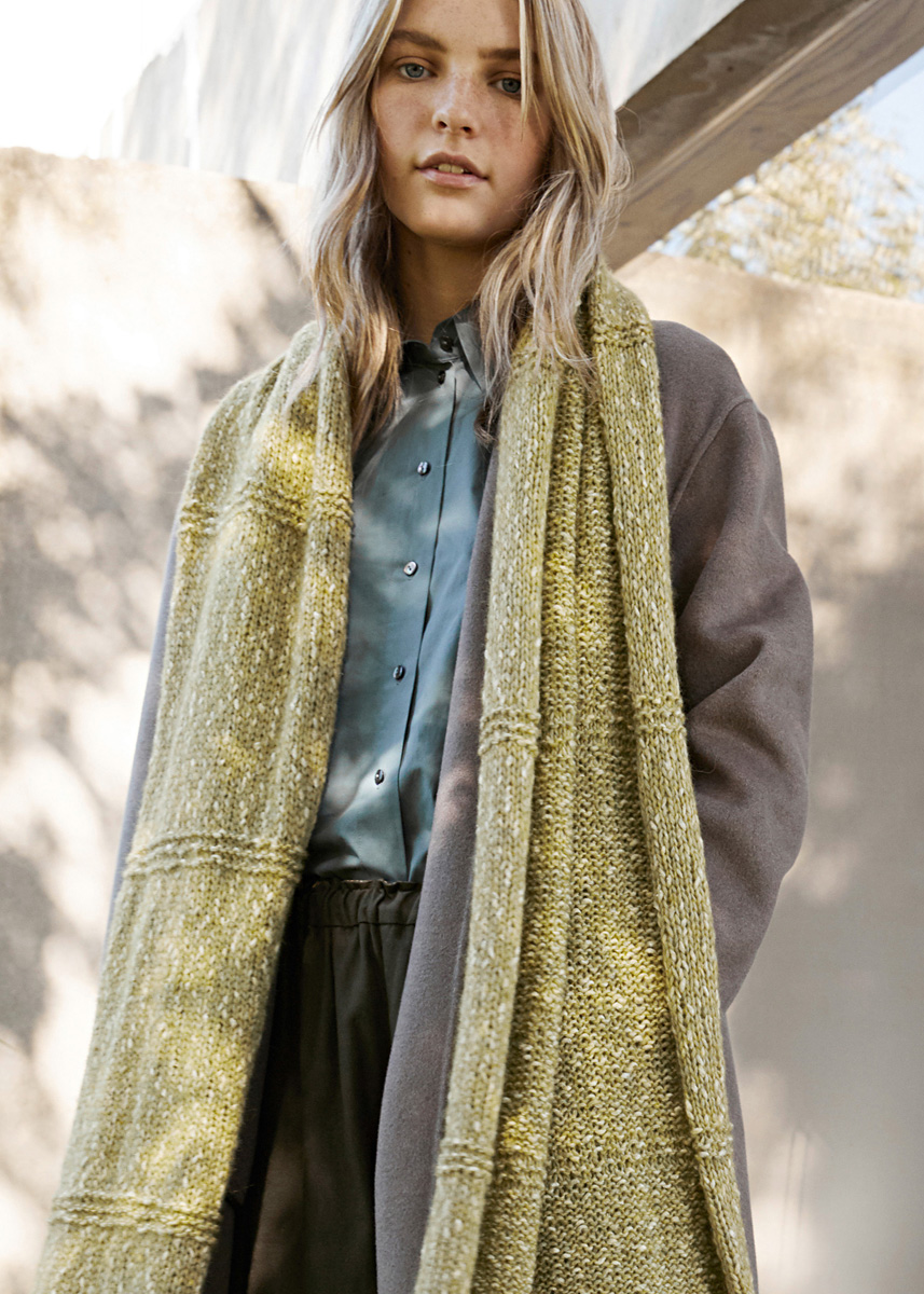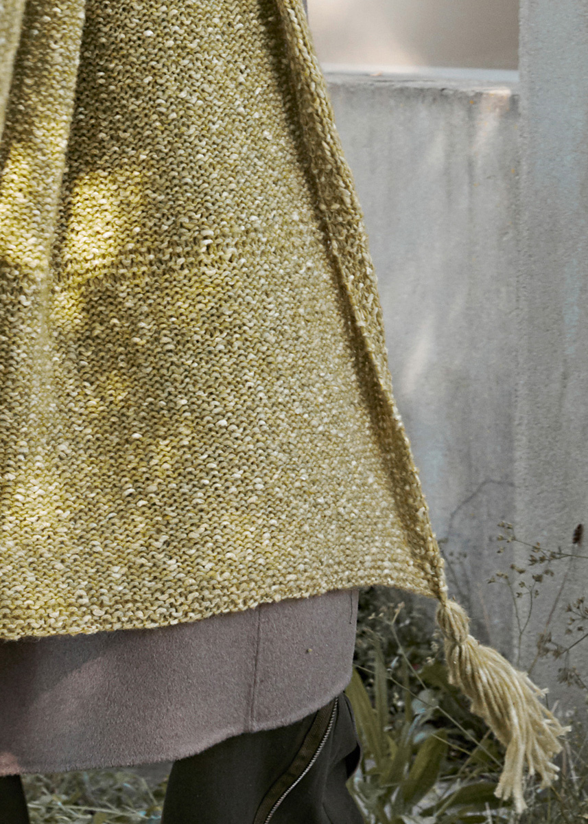 Garn von Lana Grossa, Qualität „Brigitte No. 2 Seta“ (38 % Alpaka, 33 % Polyamid, 25 % Schurwolle, 4 % Seide, Lauflänge 175 m/50 g): 350 g in Hellgrün meliert Nr. 5. Stricknadeln 6 (wenn Sie locker stricken) oder 7 (wenn Sie fest stricken) – wichtig ist, dass Sie auf die Angaben in der Maschenprobe kommen.