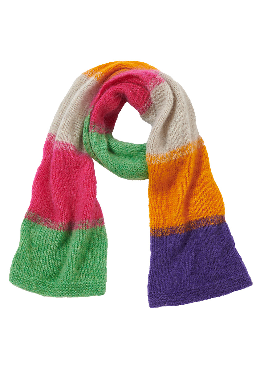 Garn von Lana Grossa, Qualität „Brigitte No. 3“ (20 % Mohair, 57 % Schurwolle, 23 % Polyamid, Lauflänge 100 m/25 g): je 75 g in Apfelgrün Nr. 59, Pink Nr. 28, Hellbeige Nr. 18, Gelborange Nr. 53 und Viola Nr. 57. Stricknadeln 5,5 (wenn Sie locker stricken) oder 6,5 (wenn Sie fest stricken) – wichtig ist, dass Sie auf die Angaben in der Maschenprobe kommen.