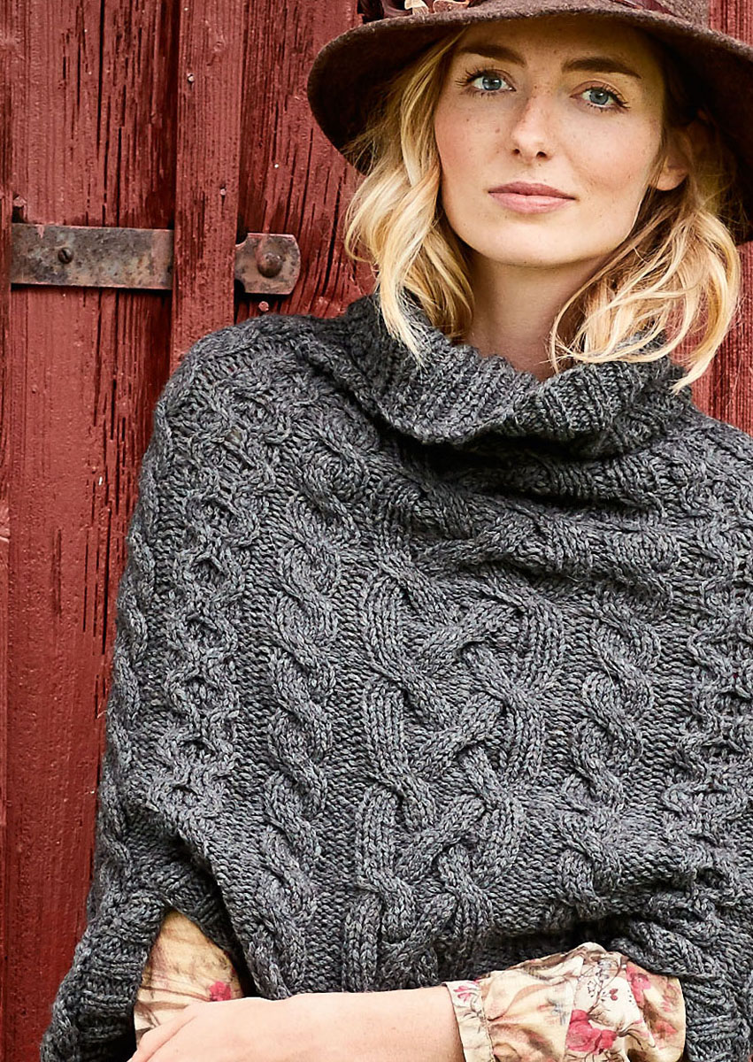 Lana Grossa Qualität „Landlust Merino 120“ (100 % Schurwolle (Merino superwash), LL = ca. 120 m/50 g): ca. 500 (550) g Dunkelgrau (Fb. 119); Stricknadeln Nr. 7 und 8, 1 Rundstricknadel Nr. 7, 40 cm lang, 1 Zopfnadel, 1 Wollhäkelnadel Nr. 7.