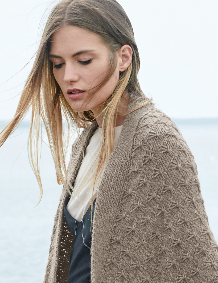 Lana Grossa-Qualität „Alta Moda Alpaca” (90 % (Baby) Alpaka, 5 % Schurwolle (Merino), 5 % Polyamid, LL = ca. 140 m/50 g): ca. 600 (650) g Grau/Beige meliert (Fb. 15); Stricknadeln Nr. 7, 1 Rundstricknadel Nr. 7, 80 cm lang, Spielstricknadeln Nr. 7.