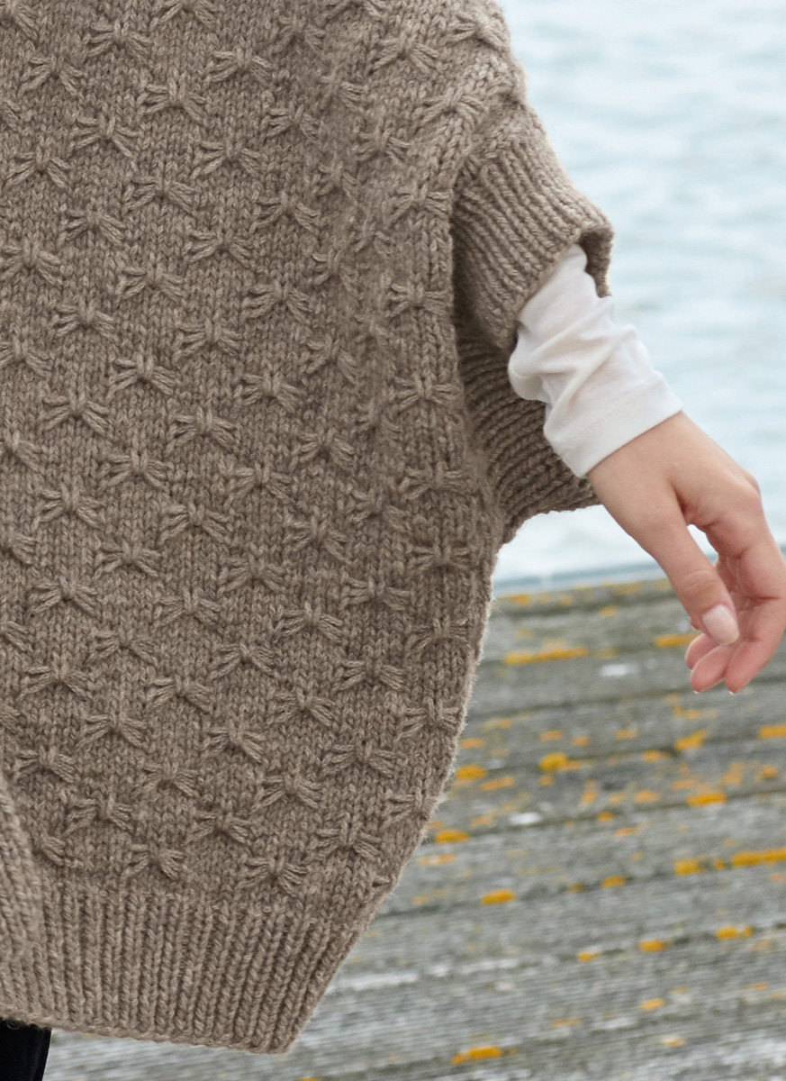 DIE WESTE ist so stark überschnitten, dass sie trotz fehlender Ärmel bis knapp zu den Handgelenken reicht. Ziemlich praktisch: zwei Teile weniger stricken und dennoch ist alles schön warm verpackt.
