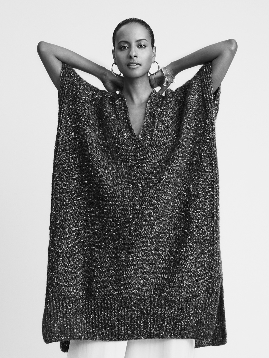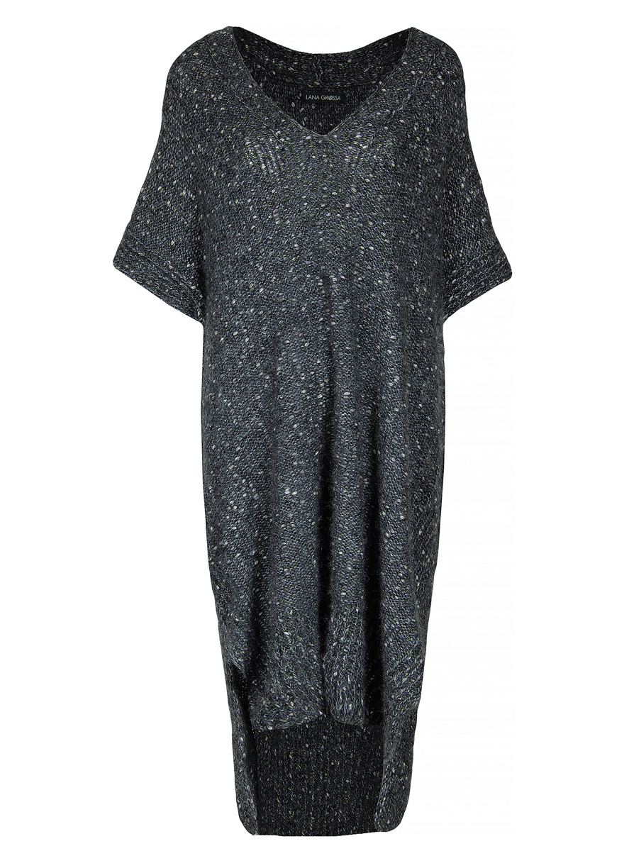 Lana Grossa-Qualität „Lala Berlin Fluffy“ (42 % Schurwolle (Merino superfine), 21 % Polyamid, 19 % (Baby) Alpaka, 18 % Mohair (Superkid), Lauflänge 130 m/50 g): ca. 600 g Dunkelgrau meliert (Fb. 107); je 1 Rundstricknadel Nr. 5 und 5,5, 80 cm lang.