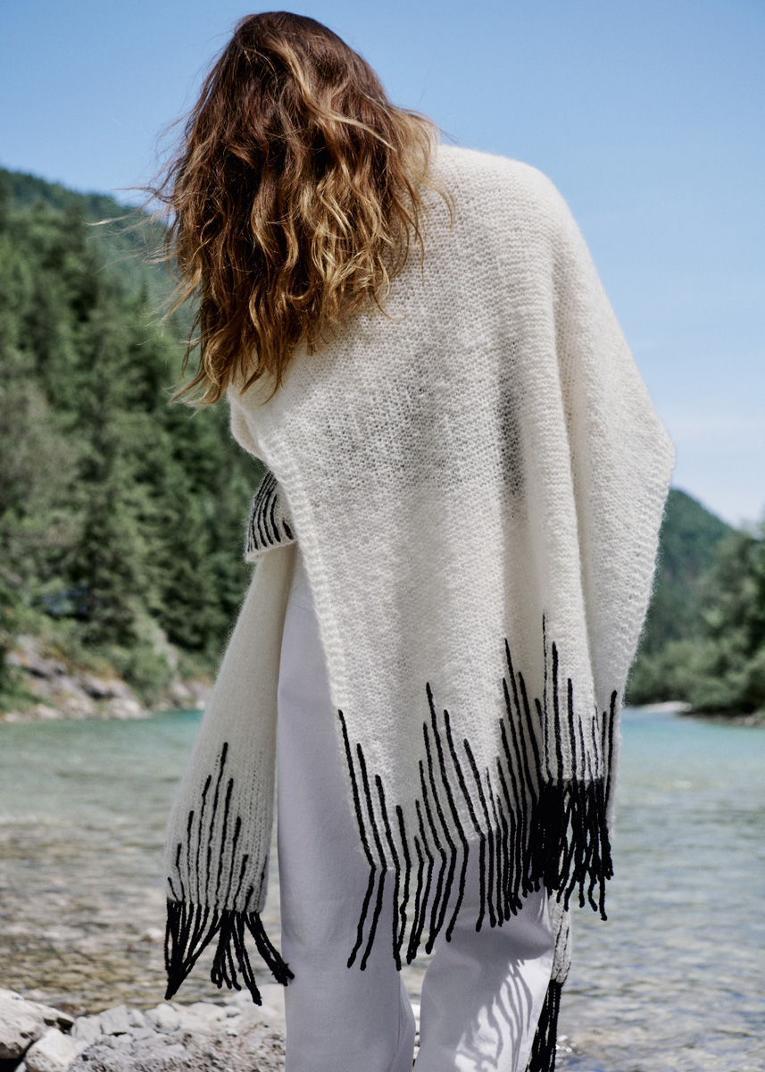 Das rohweiße Set wird glatt links gestrickt. Für Folklore-Appeal sorgen schwarze, aufgehäkelte Streifen, die bei der Stola in Fransen münden.