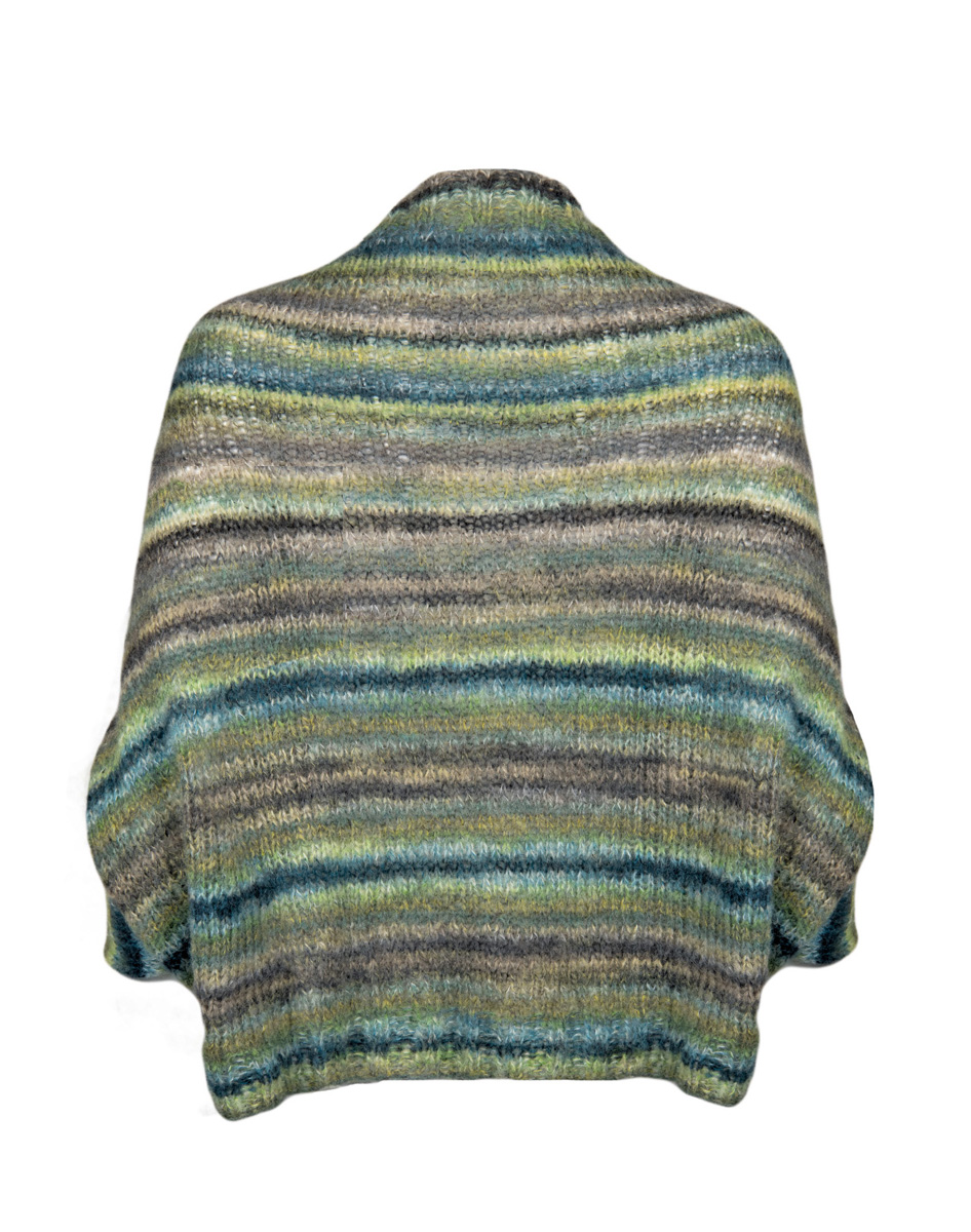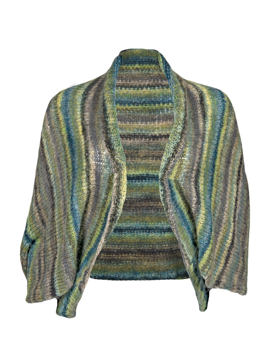 Lana Grossa Tutti (25 % Mohair, 25 % Alpaka, 30 % Polyamid, 20 % Schurwolle, Lauflänge 330 m / 100 g) 200 (200 – 300) g Petrolgrün / Rohweiß / Beige / Nachtblau / Graubraun (Fb 8); Stricknadel Nr. 5.