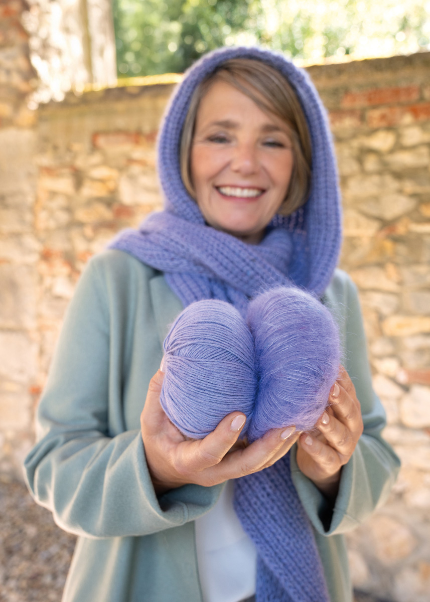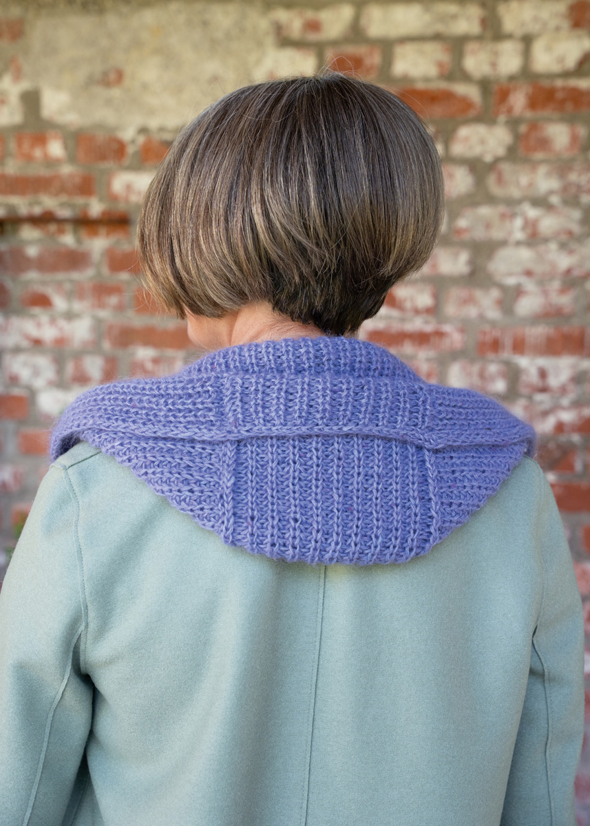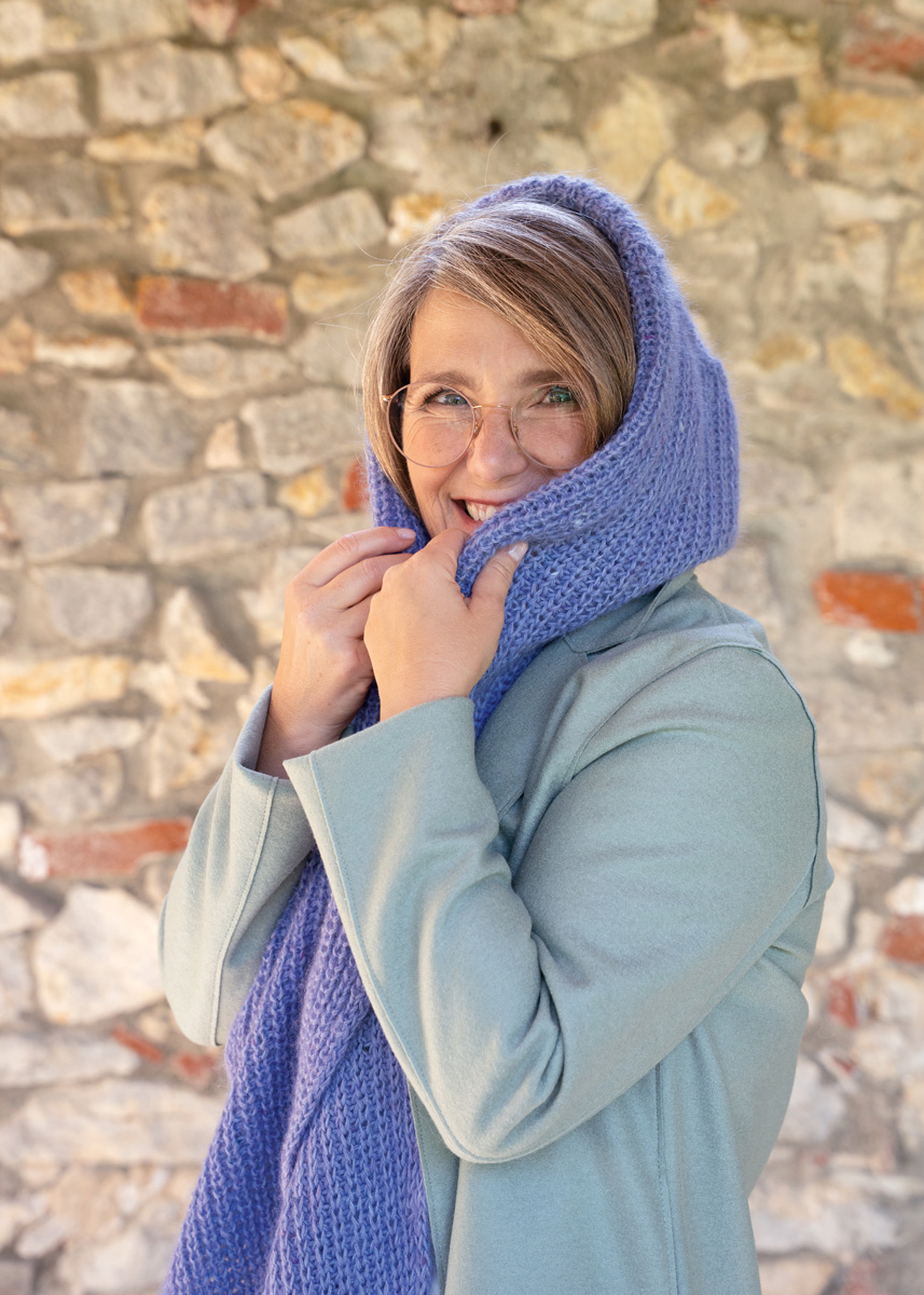 Der Cappuccio-Scarf wird nahtlos von den Schalspitzen bis zur Kapuze aufwärts gestrickt. Zunächst wird die linke Schalspitze im Halbpatentmuster mit doppelten Randmaschen an beiden Seiten und Zunahmen am rechten Rand gearbeitet. Dann werden die Maschen stillgelegt. Die rechte Schalspitze wird gegengleich mit Zunahmen am linken Rand gestrickt. Dann werden die Maschen beider Schalspitzen zusammengefasst, um über die gesamte Breite im Halbpatentmuster mit doppelten Randmaschen an beiden Seiten zu stricken. Für die obere Kapuzenrundung werden die Maschen in drei Teile geteilt, um in Hin- und Rückreihen über die Maschen des Mittelteils zu arbeiten und jeweils die letze Masche des Mittelteils mit der nächsten Masche des angrenzenden Seitenteils zusammenzustricken. Zum Schluss werden die Maschen der Kapuze mit einem schmalen Kordelrand abgekettet.