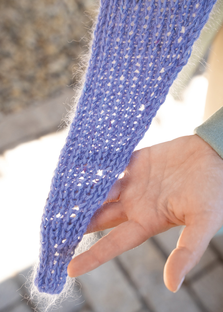Material: Lana Grossa "Ecopuno" (72% Baumwolle, 17% Schurwolle (Merino), 11% Alpaka; LL = 215 m/50 g): 150g Lilablau (Fb.214) und Lana Grossa "Natural Superkid Tweed" (60% Mohair, 30% Seide, 7% Baumwolle, 3% Polyester; LL = 200m/25g): 75g Lila (Fb.630), 2 Rundstricknadeln 5 - 6mm, 1 Spielnadel 5 - 6 mm und Maschenmarkierer.