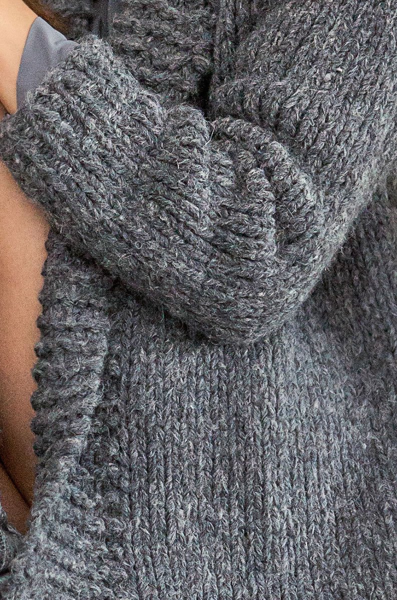 Lana Grossa-Qualität „Alta Moda Super Baby” (67 % Schurwolle, 30 % (Baby) Alpaka, 3 % Polyamid, LL = ca. 60 m/ 50 g): ca. 800 (850) g Anthrazit (Fb. 6) und Lana Grossa-Qualität „Garzato Fleece” (70 % (Baby) Alpaka, 30 % Polyamid, LL = ca. 225 m/50 g): ca. 250 (300) g Grau/Schwarz (Fb. 2); Stricknadeln Nr. 12 und 15.