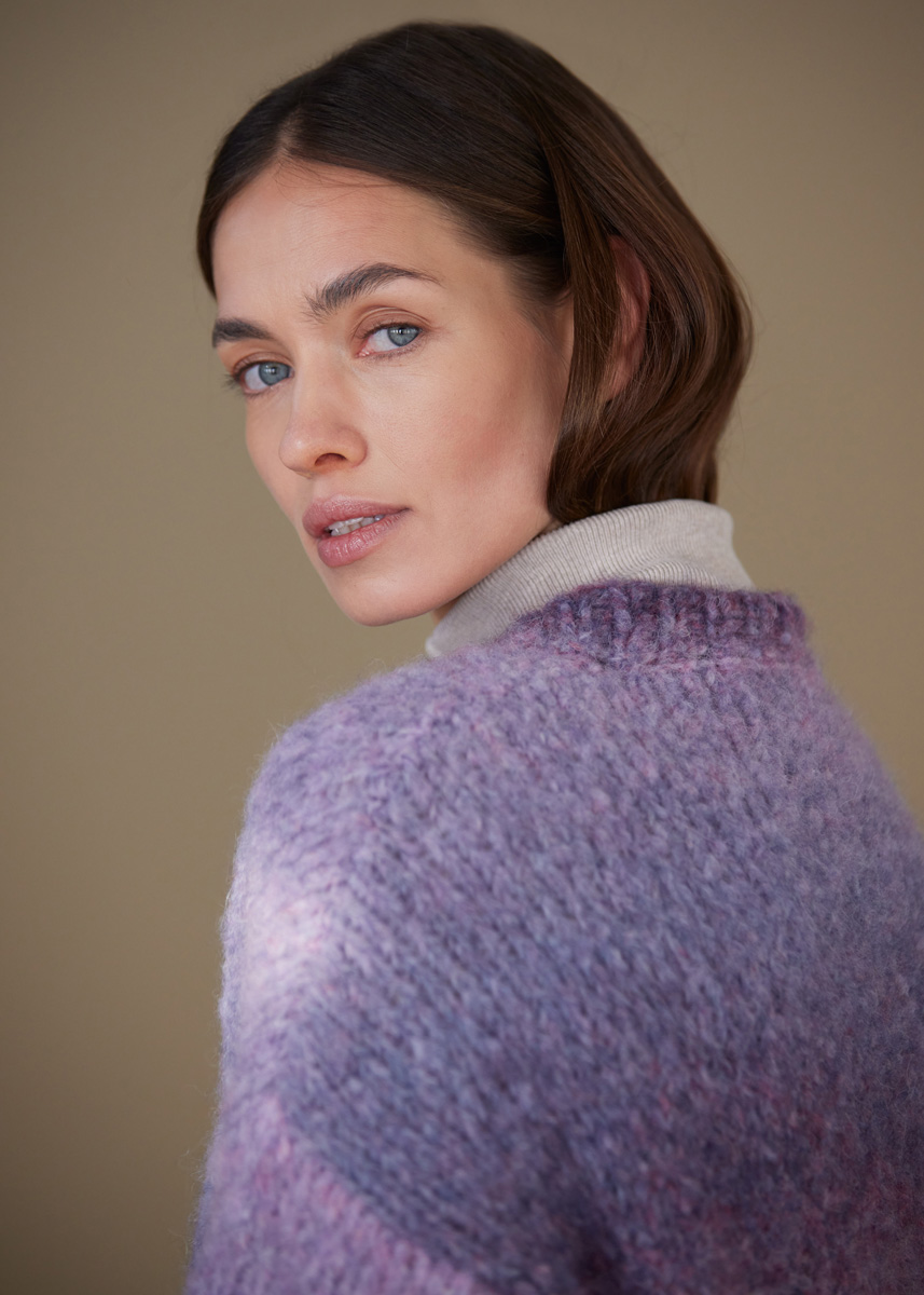 Lana Grossa-Qualität „Avio“ (63 % Alpaka (Fine), 37 % Polyamid, LL = ca 150 m/50 g): ca 250 (300 - 300 - 350) g Flieder/Aubergine (Fb 10); Stricknadeln Nr 5 und 5,5; 1 lange Rundstricknadel Nr 5.
