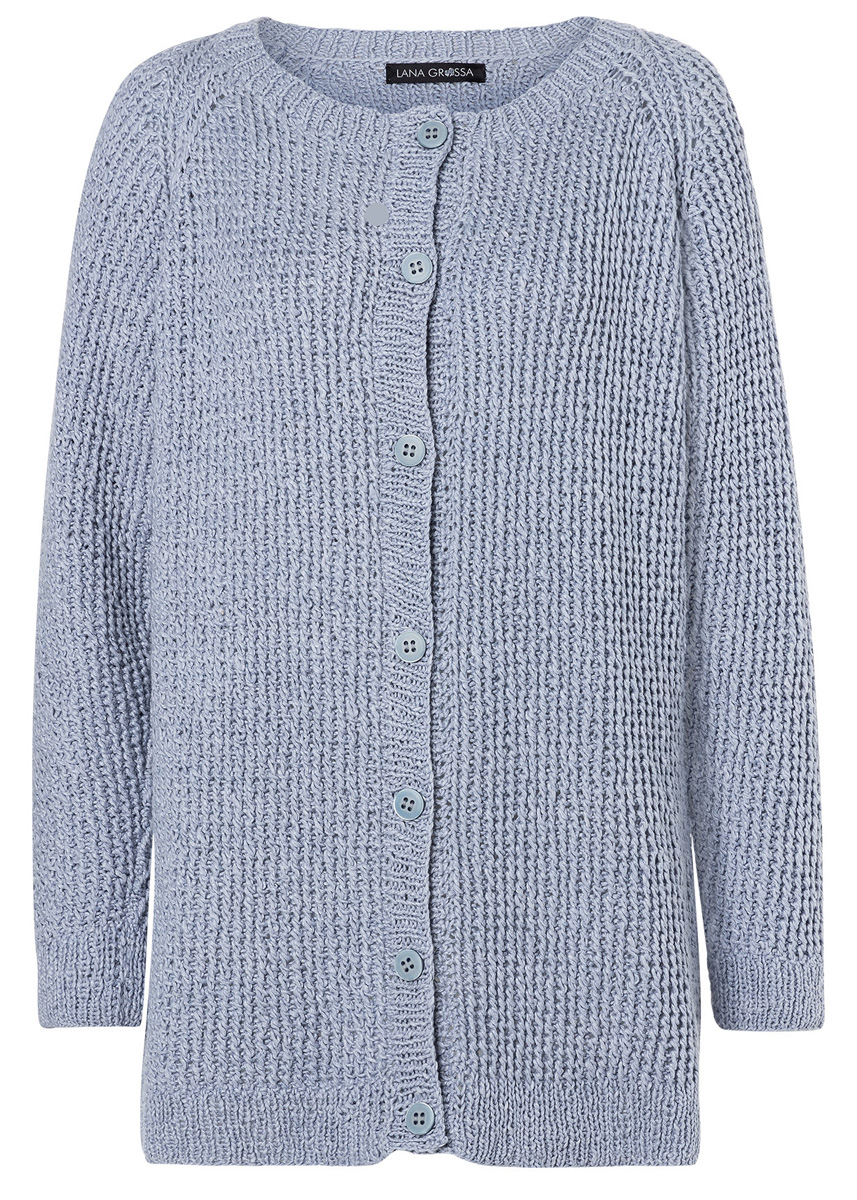 Lana Grossa Bacca (100% Baumwolle, Lauflänge 120 m/50 g), 700 (750 – 800) g Hellgrau (Fb 1); Stricknadeln Nr. 3,5 und 4,5, 1 Rundstricknadel Nr. 3,5, 80 cm lang, 7 Knöpfe von UNION KNOPF, Fb Hellgrau, Gr. 20 mm.