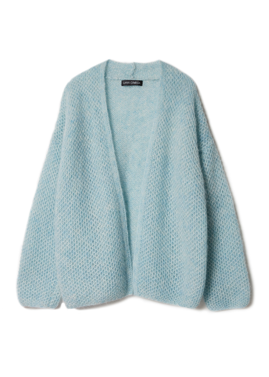 Lana Grossa-Qualität „Bella“ (35 % Baumwolle, 30 % Nylon, 25 % Alpaka (Baby), 10 % Schurwolle (Merino), LL = ca 250 m/25 g): ca 125 (150 - 175 - 200) g Aquamarin (Fb 22); Lana Grossa-Qualität „Silkhair“ (70 % Mohair (Superkid), 30 % Seide, LL = ca 210 m/25 g): ca 150 (175 - 200 - 225) g Rohweiß (Fb 52); Stricknadeln Nr 4,5.