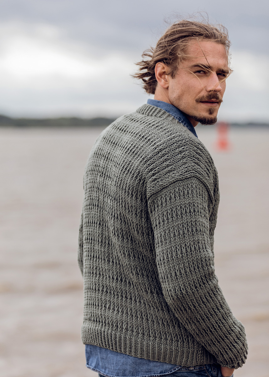 Form und Garn dieser Jacke stammen noch aus Großvaters Zeiten. Der neue (und edle) Twist kommt über das Hebemaschenmuster in Trendfarbe Salbei.