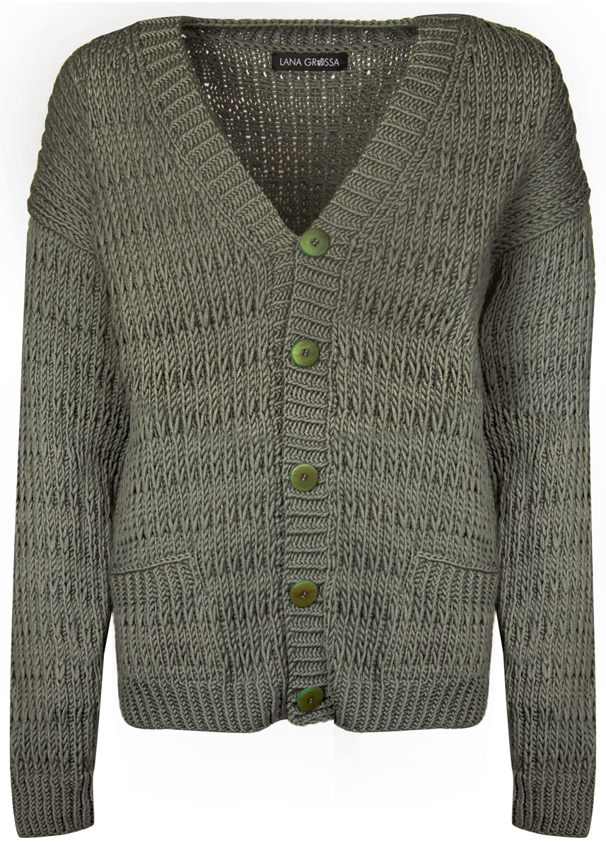 Lana Grossa Bingo (100% Schurwolle, Lauflänge 80 m/50 g), 750 (800 – 850) g Khaki (Fb 732); Stricknadeln Nr. 5 und 6, 1 Rundstricknadel Nr. 5, 100 cm lang und 5 Knöpfe von UNION KNOPF, Art. 451190, Fb 26, Gr. 23 mm.