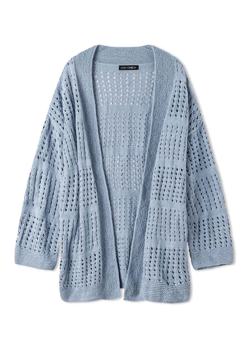 Ruhiges Graublau, klare Linien und ein grafischer Lochmustermix setzen bei diesem Set coole Akzente. Die kraus gestrickten Blenden verleihen dem Cardigan einen kompakten, sauberen Rahmen.