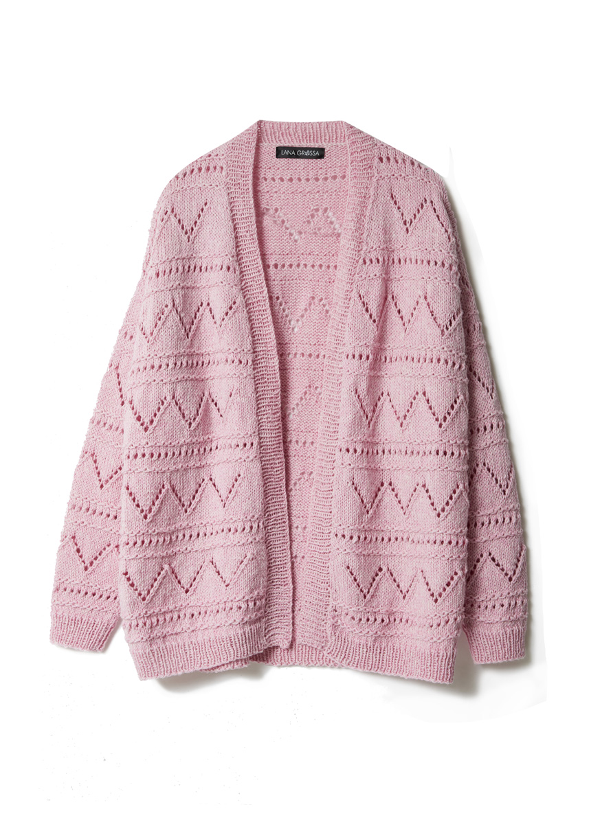 Nelke heißt der Rosa- Ton, der diesen Cardigan zum Eyecatcher macht. Seine gerade, schlichte Form passt zu vielen Looks und lässt seine Ajourmuster super zur Geltung kommen.