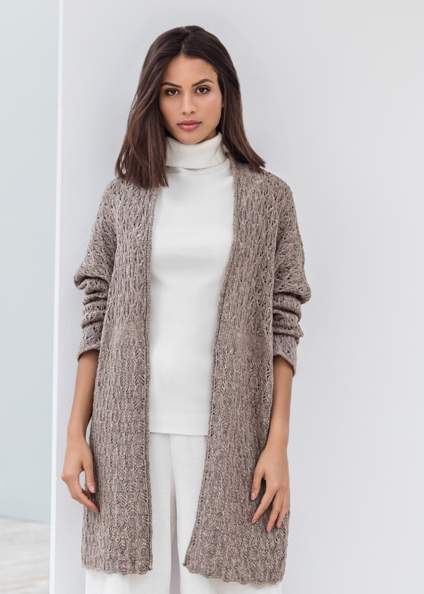 Lana Grossa Cashmere 16 Fine (80% Schurwolle, 10% Kaschmir, 10% Polyamid, Lauflänge 320 m/50 g), 350 (400 – 400 – 450) g Taupe (Fb 7); Stricknadeln Nr. 4,5, 1 Rundstricknadel Nr. 4,5, 120 cm lang.