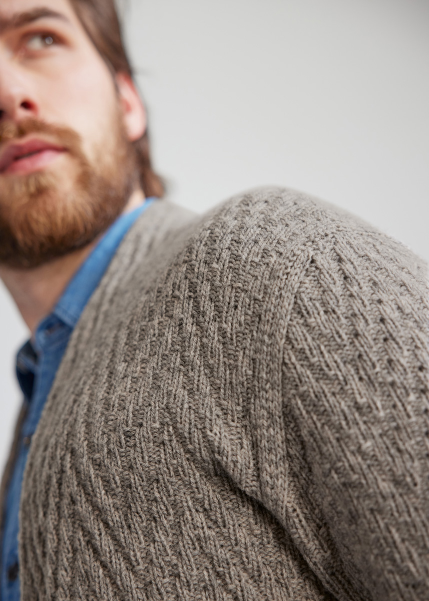 Meliertes Kettengarn und ein markantes Zackenmuster machen diesen Cardigan interessant. Da darf die Farbe auch mal dezent und die Form super schlicht sein.