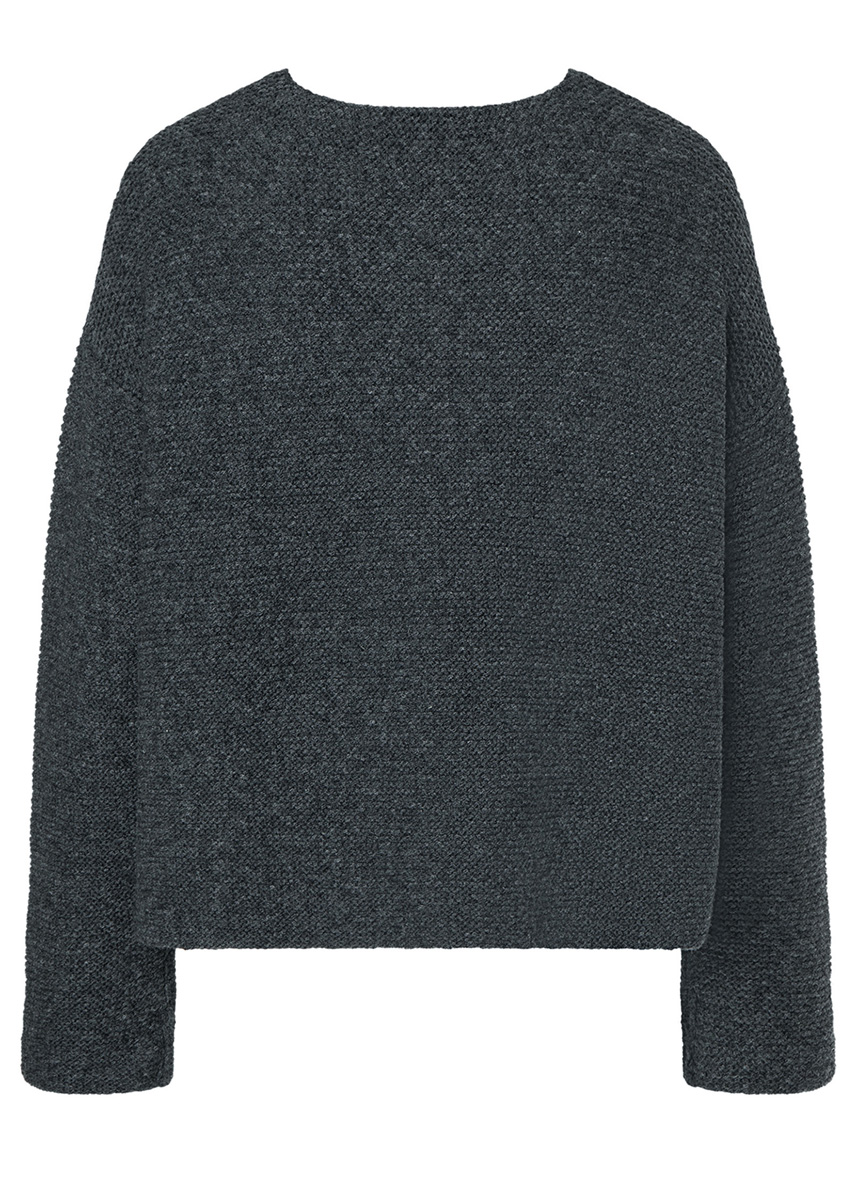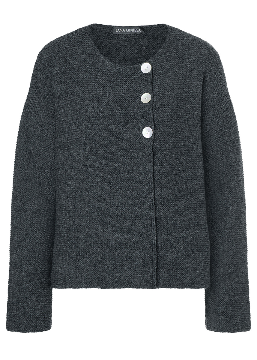 Lana Grossa Cashmere 16 Fine (80% Schurwolle (Merino), 10% Kaschmir, 10% Polyamid, Lauflänge 320 m/50 g), 350 (400 – 450) g Anthrazit (Fb 17); Stricknadeln Nr. 5, 1 Rundstricknadel Nr. 5, 40 cm lang, von UNION KNOPF: 3 Perlmuttknöpfe, Art. 37604, Fb 12, Gr. 23 mm und 1 Druckknopf.