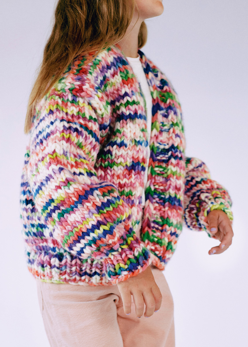 Lana Grossa Confetti (100% Schurwolle (Merino), Lauflänge 50 m/100 g), 600 (700 – 800) g Erdbeer/Viola/Fuchsia/Grün/Blau/Weiß (Fb. 2); Stricknadeln Nr. 8 und 9, je 1 Nadelspiel Nr. 8 und 9, 1 Häkelnadel Nr. 7.
