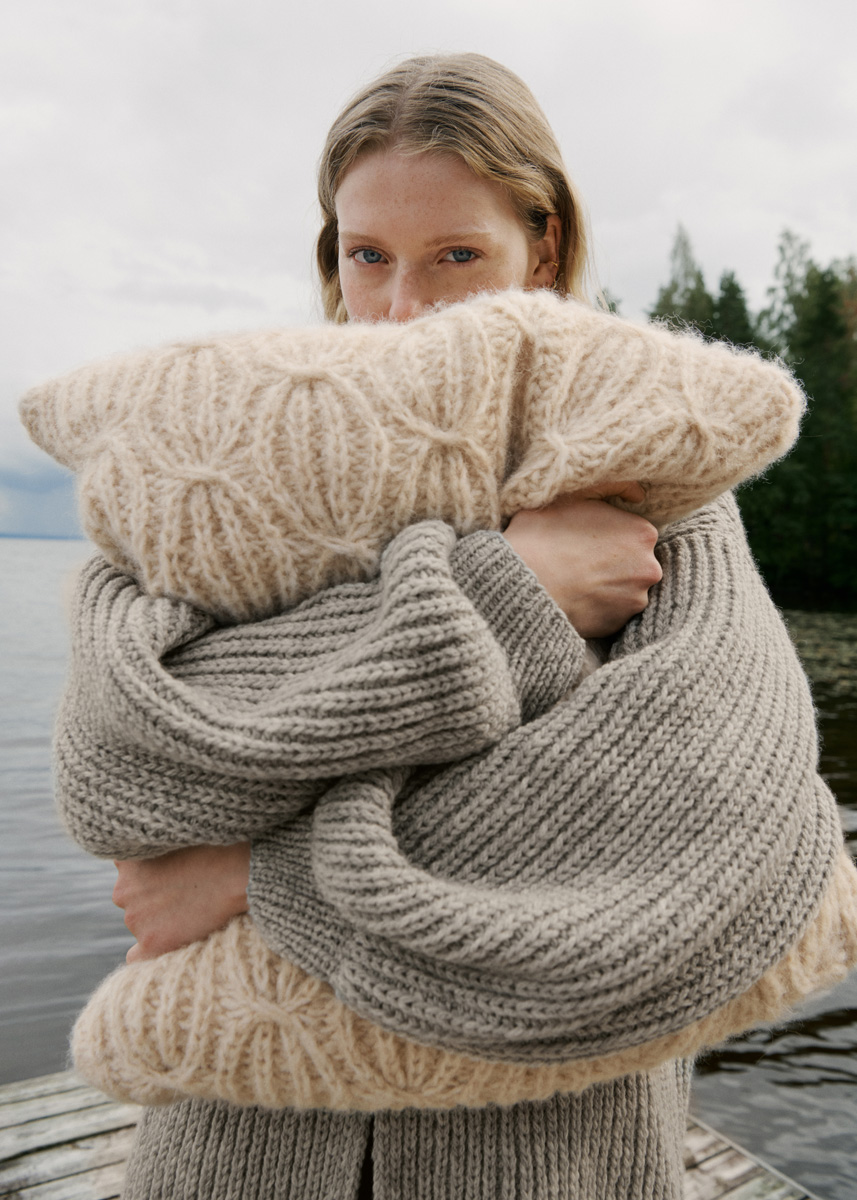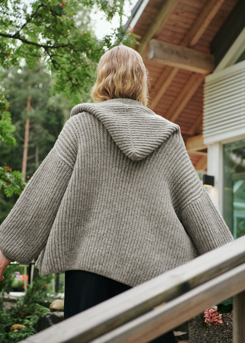 Helles Grau, ein plastisches Muster, ballonweite Ärmel und eine großzügige, angestrickte Kapuze: So sieht ein modernes Basic aus.