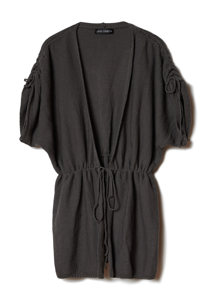 Lana Grossa-Qualität „Cotton Wool” (53 % Schurwolle (Merino extrafine), 47 % Baumwolle, LL = ca. 195 m/50 g): ca. 400 g Dunkelgrau (Fb. 7); Stricknadeln Nr. 2,5 und 3,5, 1 Wollhäkelnadel Nr. 3,5.