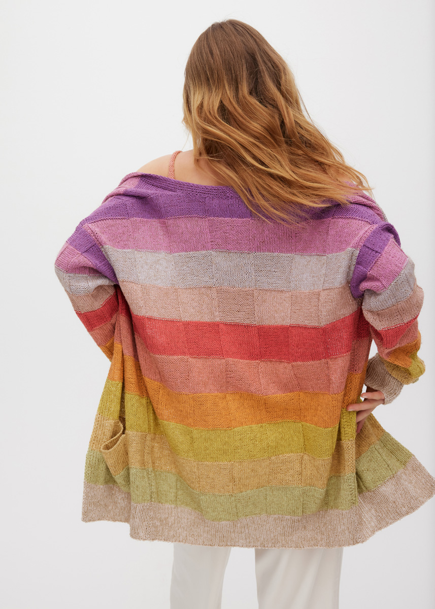 Anders als beim Pulli (linke Seite), werden hier auch die Ärmel im Strukturmuster gestrickt. Dazu gibt es eine lässige Länge, die bis über die Hüfte reicht.